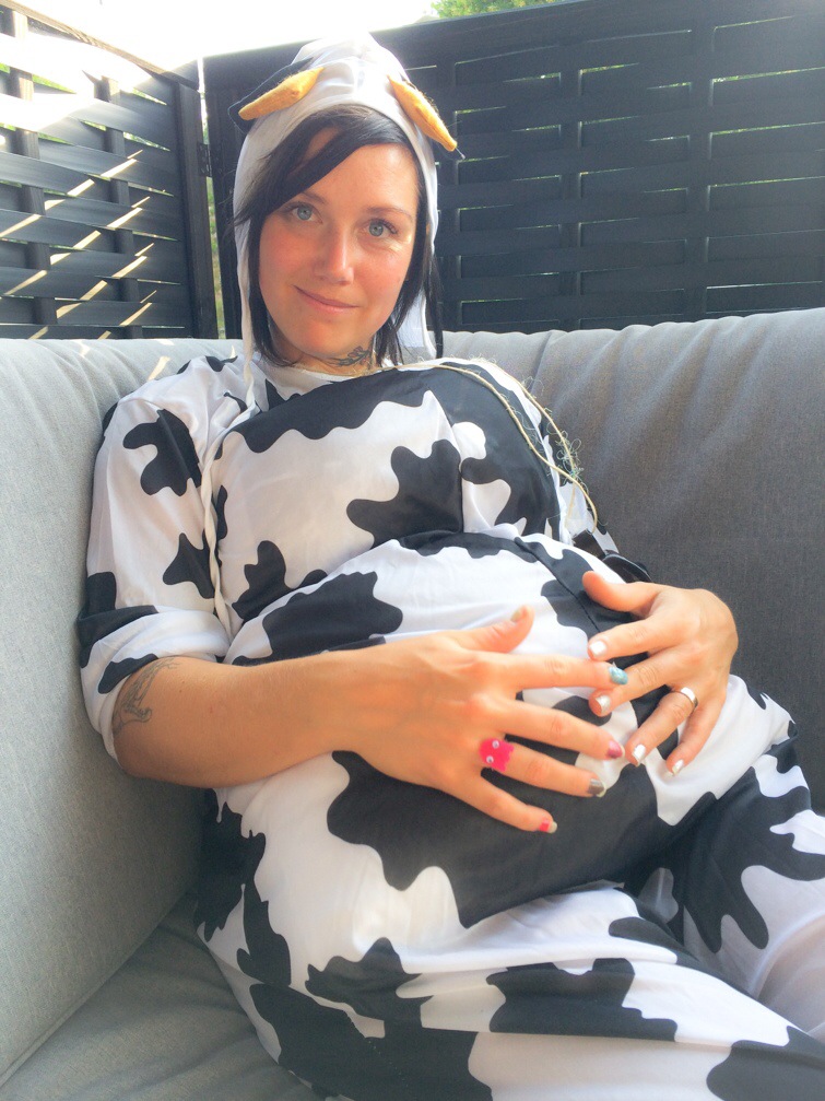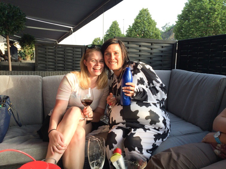 Gårdagen var det ja. När Anna kom till hotellet var hon riktigt riktigt förvånad! Hon trodde ju att hon skulle jobba och att vi skulle ha vanlig filmkväll på kvällen, för Emil ”var i Göteborg”, så hon vart minst sagt förvånad! Det tog lång tid innan hon slutade titta mystiskt på oss och faktiskt började acceptera det faktum att det var möhippa. Vi hade en god frukost och sen fick hon ett stort paket och vi skickade in henne på toan där hon skulle byta om. Jag har aldrig hört henne skratta så mycket som när hon tog på sig sin fina kodräkt. Hon fick även en kudde framför magen som fyllde ut den, så hon gick runt på stan och såg gravid ut haha. Hon är annars jätte liten kan jag tillägga. Vi åkte hem till mina föräldrar som har ganska stort kök, så vi skulle få plats att baka. Som den superwoman jag är tog jag mig an uppdraget att färga degen med grön karamellfärg, vilket var en fruktansvärt dålig ide eftersom jag inte fick bort färgen sen. Varken tvål, schampo, diskmedel, aceton eller lacknafta hjälpte, snacka om att mina händer var torra sen, men bioterm gjorde susen.