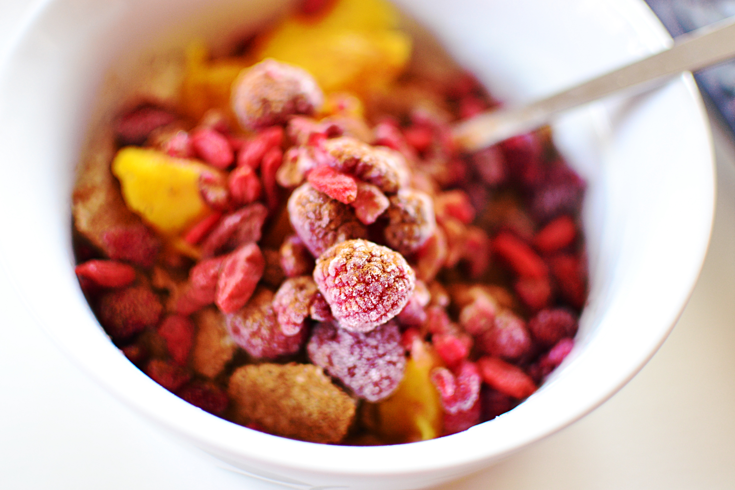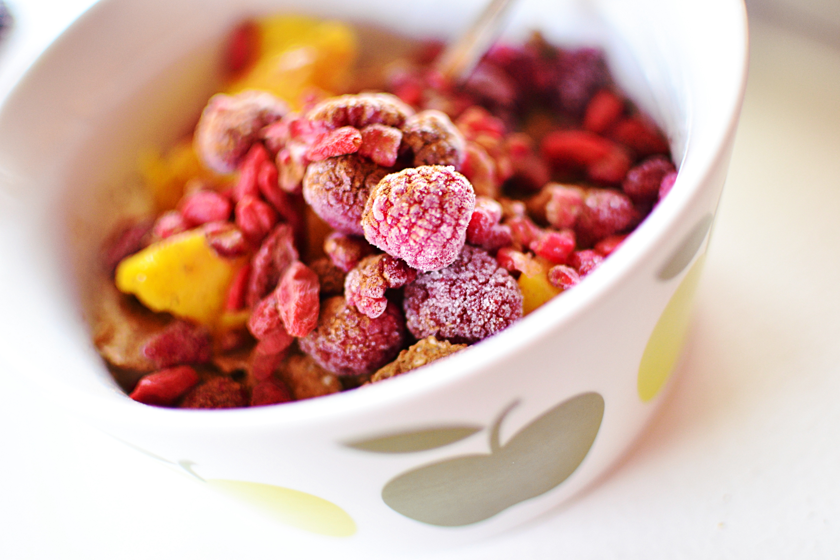 Kvarg uttunnat med soyamjölk och smaksatt med ca 2 tsk proteinpulver och vaniljessens. Havreflakes, mango, hallon, gojibär och kanel.