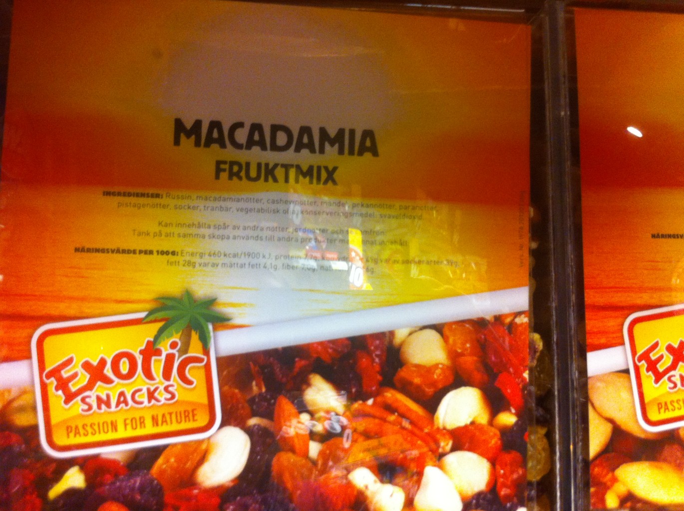 Den här är relativt bra. En innehållsförteckning börjar alltid med det som produkten innehåller mest av, i det här fallet russin följt av macadamianötter. Socker finns också, dock långt bak.