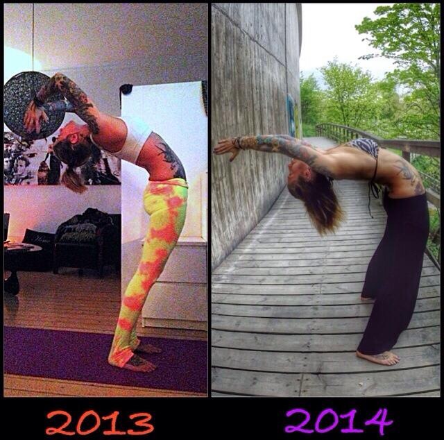 Jag började träna yoga mer seriöst för lite drygt ett år sen, och ibland kör jag, som alla andra, fast lite grann i min utveckling och ifrågasätter om jag ens kommer framåt eller står och stampar. Jag hade en sån dag häromdagen, och kände mig orättvis mot mig själv; för jag tränar nämligen hårt. Jag sliter, jag svettas, jag läser på och jag bråkar med disciplinen. Så jag började bläddra bland mina foton i mobilen, tills jag hittade en bild på mig själv i en yoga-ställning för ungefär ett år sedan. Sen hittade jag en bild på samma ställning, fast tagen för ca två veckor sen och satte de bredvid varandra. Och voilà: resultat. Rejält sådant.