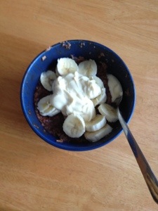 Havregrynsgröt med kakao, lite müsli (någon med vaniljblablabla och frukt), solroskärnor. Toppat med banan och vaniljkesella. DET BLEV HIMMELSKT! Till det drack jag ett stort glas vatten och åt ett kokt ägg.