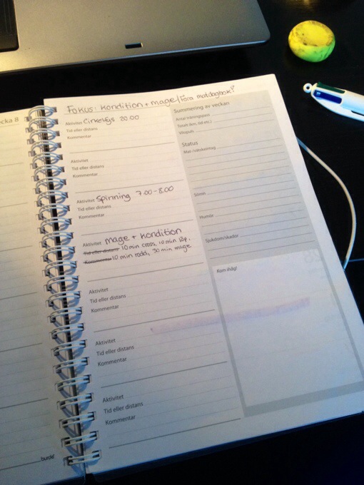 Som en paus i hemskrivningen så satte jag mig ned för att planera den kommande veckan. Jag har börjat göra det nu för att se till att jag verkligen tränar, och dessutom för att man då har bättre överblick över sin vecka. Nu har jag tänkt mig att jag ska börja med olika fokusområden varje vecka, så veckans fokus blir kondition och mage. Jag har väldigt svårt för att träna kondition, så därför tänker jag att om jag har fokus på det så är det ju bra… Så här kommer min träningsvecka att se ut! 20140216-131137.jpg
