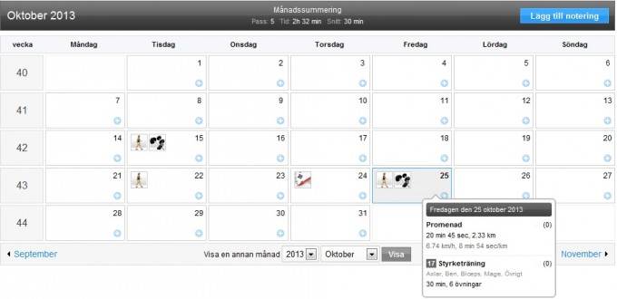 Jag har legat lite på latsidan den senaste tiden och det känns i hela kroppen att det är dags att kicka igång igen. Det är nästan så jag skäms över hur tom min träningsdagbok är denna månaden. 5 träningspass på 25 dagar är inte mycket att skryta om. Jag ska se till att fylla dagarna i November bättre! Förresten medan jag ändå skriver kan jag ju tipsa om www.shapelink.com , en hemsida där man loggar sina träningspass,vikt,mått osv. Man kan skapa personliga utmaningar eller gå med i allmäna så som ”Flest kilometer cykling 2013” och tävla mot hela Sverige. En mycket bra sida för att hålla koll på sin träning. Finns såklart också en liten smidig app!