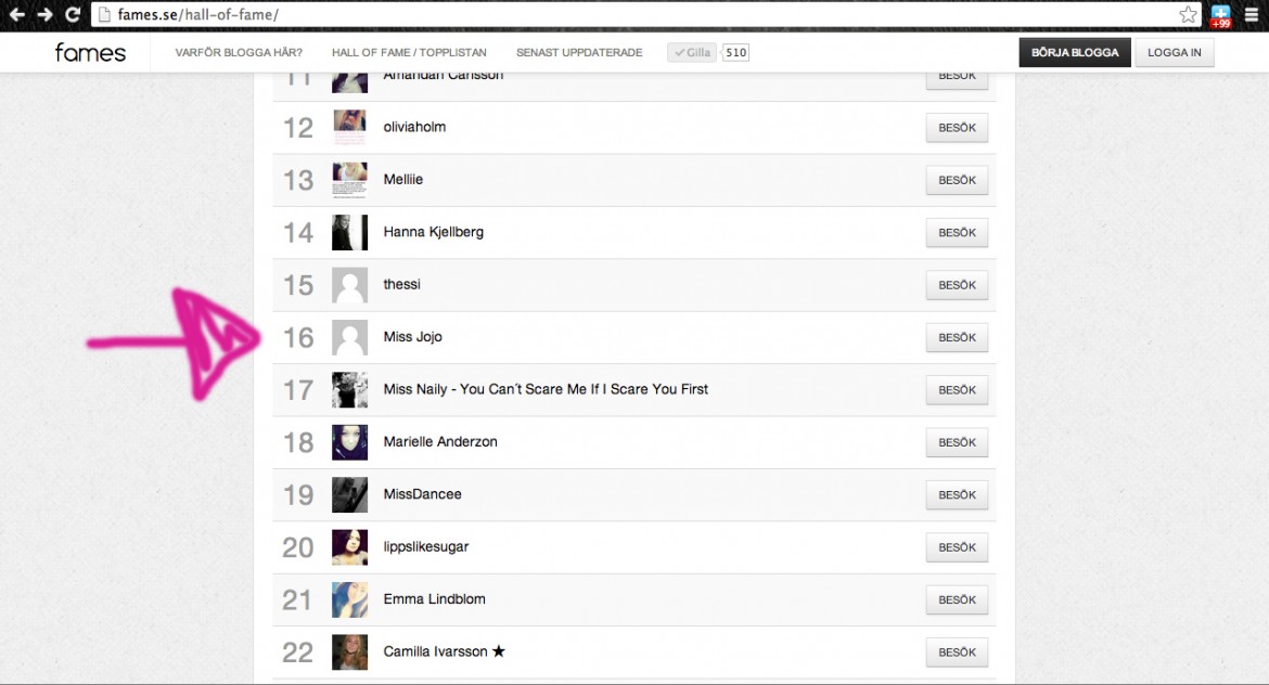 Hall of fame 4 september 2013 av missjojo Såg nyss mig själv på hall of fame. Det var ju lite kul. Kanske inte jätte högt på listan, men ändå 😉 Och statistiken ökar 😀