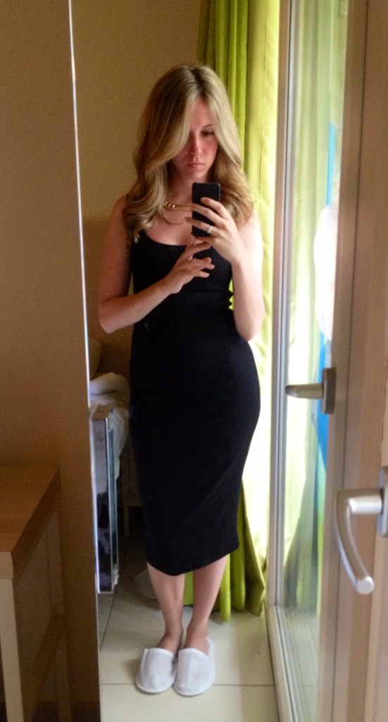 Beställde denna enkla svarta klänning från hm för 99 kr. Super skön här i värmen!! Ska så klart inte ha tofflor på mig när jag går ut….. 🙂 Lyckades locka håret första gången med plattång. Mycket lättare nu när jag inte har löshår.