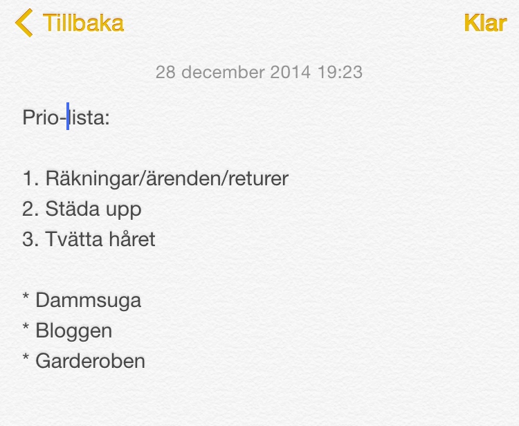 Exempel på kvällens prio-lista (för idag hade jag noll lust att göra något, så trött som jag var och började få smått panik över att inte få något gjort + över hur jag ens skulle gå tillväga med att börja). Normalt brukar jag sudda bort när jag fått något gjort, känns skönt 😀 Men idag lät jag det vara för att visa. Jag hann få de 3 första punkterna avklarade. Blev för sent för att dammsuga så jag hoppade till punkten efter. Men stjärnpunkterna var det ju inte hela världen om de inte blev gjorda ikväll 😉 Så jag är nöjd! Egentligen skulle väl nr 2 vara en stjärnpunkt också för det är väl inte hela världen om det är lite stökigt, men eftersom jag inte bor själv och det påverkar Juan också, satte jag det som ett nummer. Man får överväga konsekvensen.