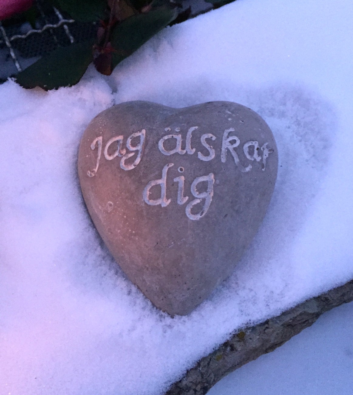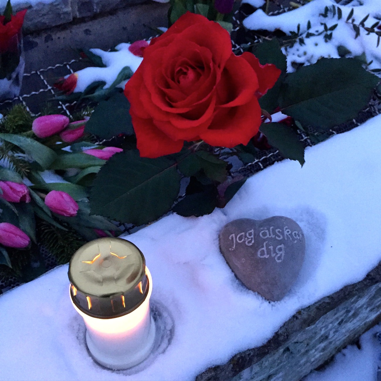 Igår var årsdagen. Det gick väl så okej som det kan gå under omständigheterna. När Juan kom hem från jobbet åkte vi till minneslunden. Köpte en röd ros och en sten med texten ”Jag älskar dig”. Och ett ljus. Ville köpa en liten nallebjörn men det fanns inte. Ångrar mig att jag inte åkte i förväg och letade upp och köpte en till honom. Vet inte varför men fick jätte dåligt samvete att han inte fick en nallebjörn av mig, som jag hade planerat. Förmodligen är det en annan underliggande orsak för det och inte själva nallebjörnen i sig. Ibland får jag jätte dåligt samvete och en ångerkänsla för små detaljer, kring det hela. Hur som helst, vi åkte till minneslunden och tände ljus. Det var jobbigt där men vi stod i alla fall en stund och tänkte och höll om varandra. Efter det åkte vi hem, tog det lugnt och pratade lite om allt.
