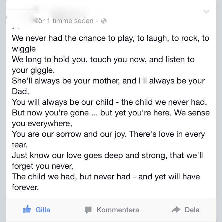 Skönt att man i alla fall har varandra genom det hela. Det var jobbigt igår men samtidigt försökte vi tänka på honom på ett positivt sätt och komma ihåg hur fin han var. Juan är inte den som lätt visar känslor utåt (även om han är väldigt känslig), så igår blev svårt för honom när han väl valde att öppna upp sig. Det blir nog så när man trycker ner en massa känslor under en viss tid. Jag själv bröt ihop dagen innan, vilket faktiskt kändes nästan skönt, som en lättnad. Jag ville inte bryta ihop på just årsdagen, då ville jag försöka tänka på honom och glädja mig för den lilla stund vi hade. Även om det var otroligt svårt och en massa tårar kom igår ändå, kändes dagen ändå fin på något vis. Såg att Juan senare la en dikt på fb som kändes skönt att läsa och att han valde just den. Det kändes som en bekräftelse på att vår pojke aldrig någonsin blir glömd och att han alltid finns i våra hjärtan. Att vi går genom detta tillsammans och att det är inte bara är mina känslor, utan våra.