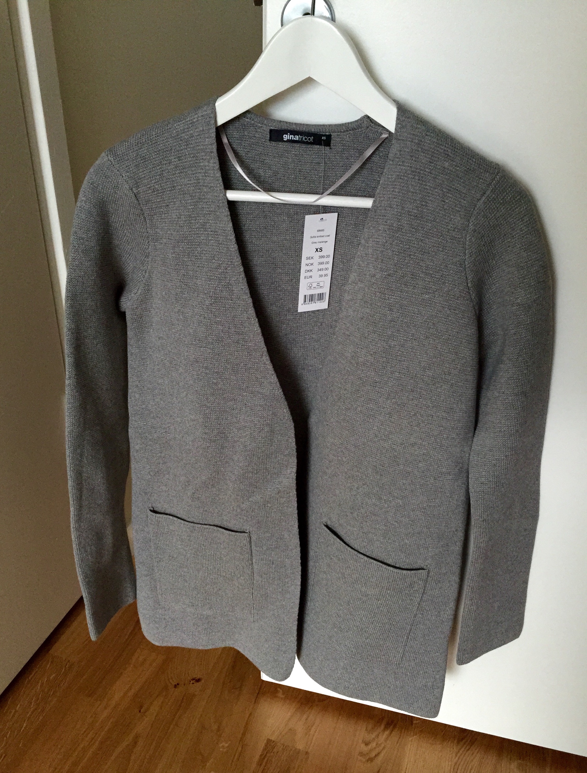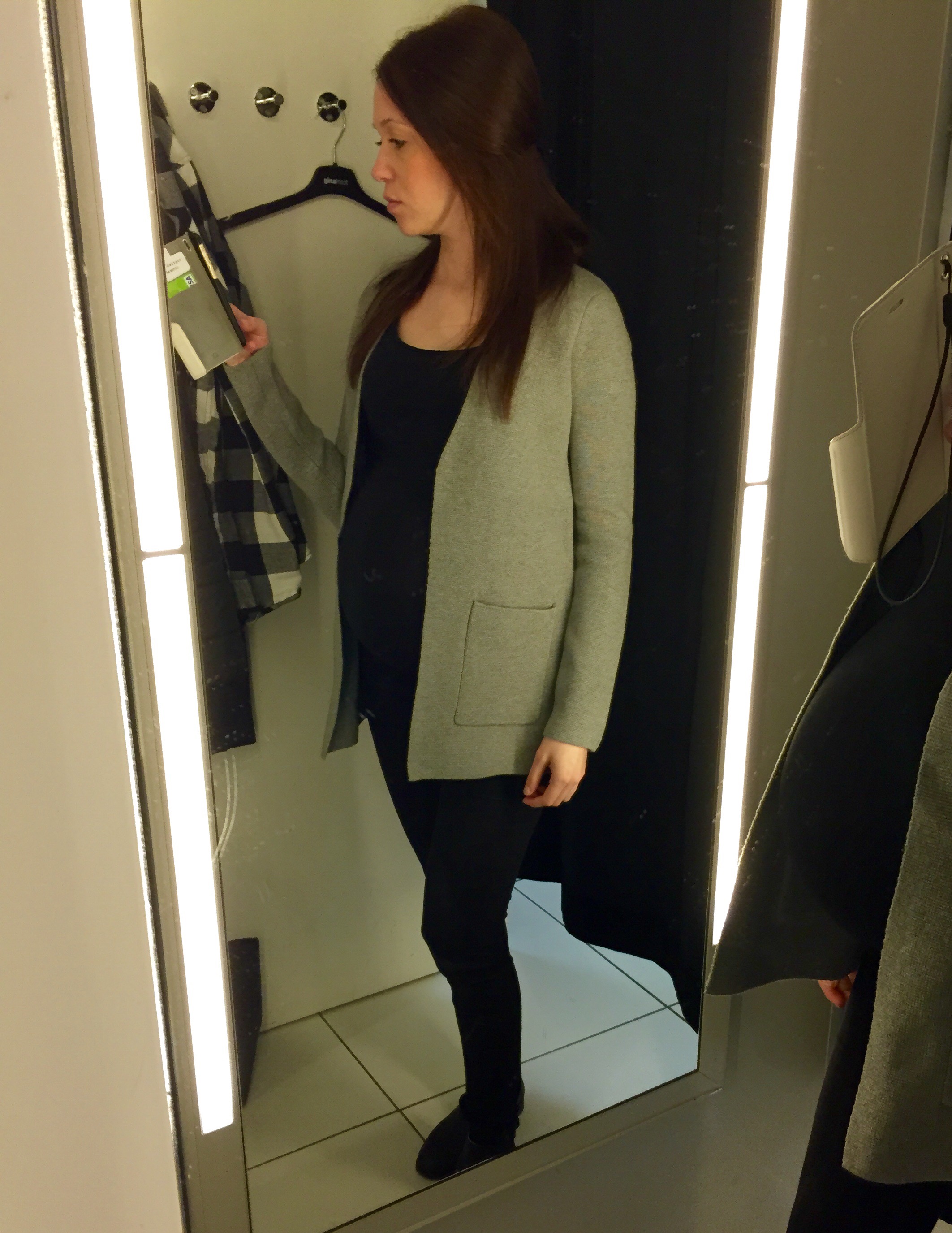 Kavajen kanske inte ser så snygg ut på galgen eller på gravida mig nu men den är verkligen snygg i verkligheten. Passar med både en elegant tröja under eller en casual t-shirt och ett par jeans. Örhängena var svåra att fota med mobilen i solljuset och jag orkar inte fota om de nu… men ja, ni kan nog tänka er till hur de ser ut 😉
