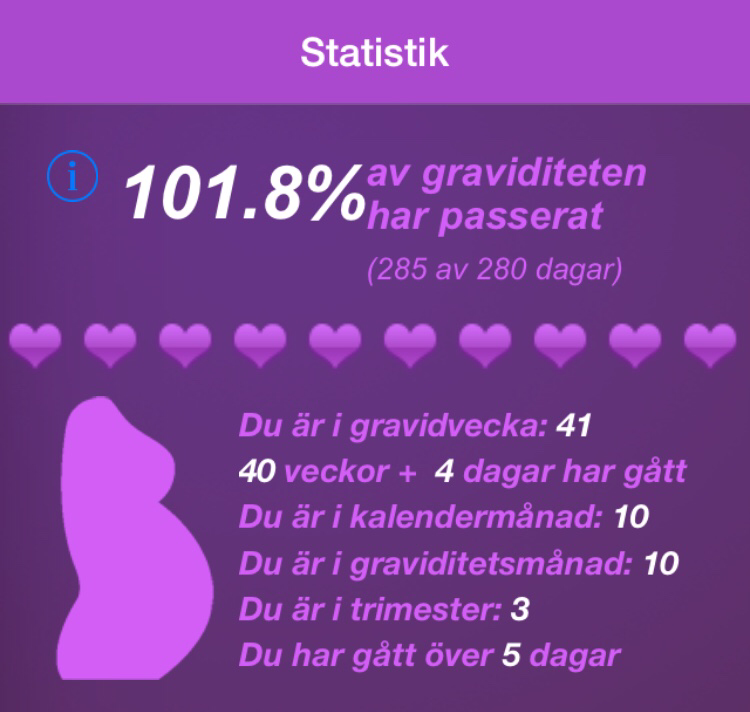 Är visserligen väldigt trött och mår illa av och till. Lillen ”hoppar” på huvudet i timmar i sträck på kvällarna/nätterna så kanske vill han ut trots allt. Men sen händer inget. Jag vet att det är vanligt att gå över tiden. Det är tydligen bara 4 % som faktiskt föder på BF men man blir frustrerad ändå. Att inte veta när det blir. Och en lite ny noja jag har fått är att han kommer bli ännu större än vad de beräknat. Inget fel på stora bebisar men han ska ju komma ut också! Magen hade växt 1 cm på en vecka nu när jag var på senaste kontrollen. Plus att jag inte vill bli igångsatt och är rädd för det, jag vill att det ska gå igång naturligt.