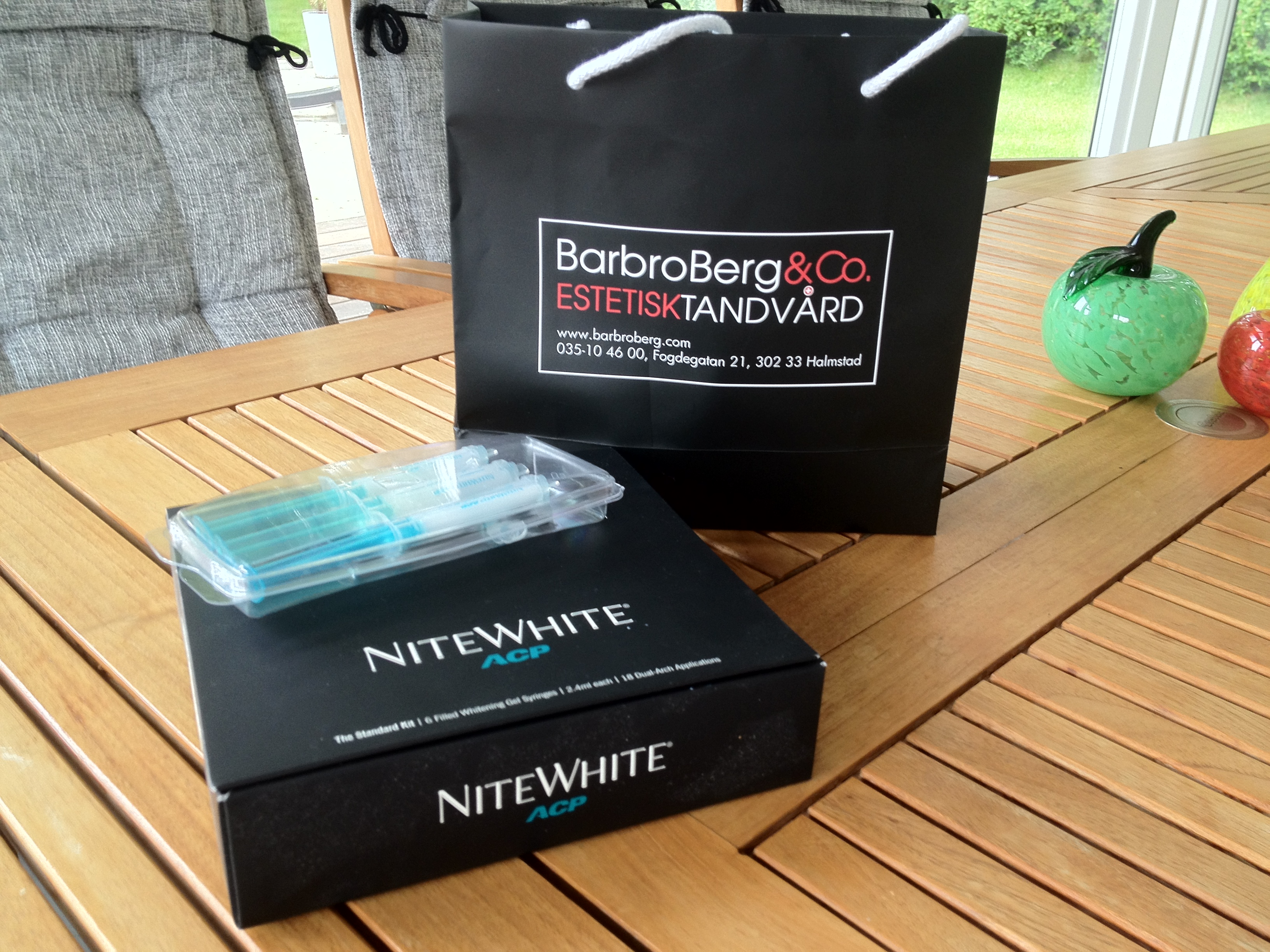 Här är bild utanför butiken SODA i Halmstad, igår, där tröjorna ”Never Tell Your Tailor” finns 🙂 Det är de vi ser i skylltfönstret! Under är bild på blekningsmedlet jag har till tänderna som kommer från Barbro Berg i Halmstad!