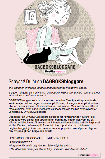 Jag är en dagboksbloggare, vad är du? 7 okt 2014 av moas Jag gjorde ett test HÄR om vilken bloggtyp jag är, svaret jag fick var dagboksbloggare.