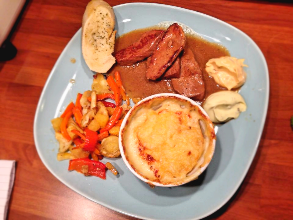 Till varmrätt så var det potatisgratäng, varma grönsaker och kött.