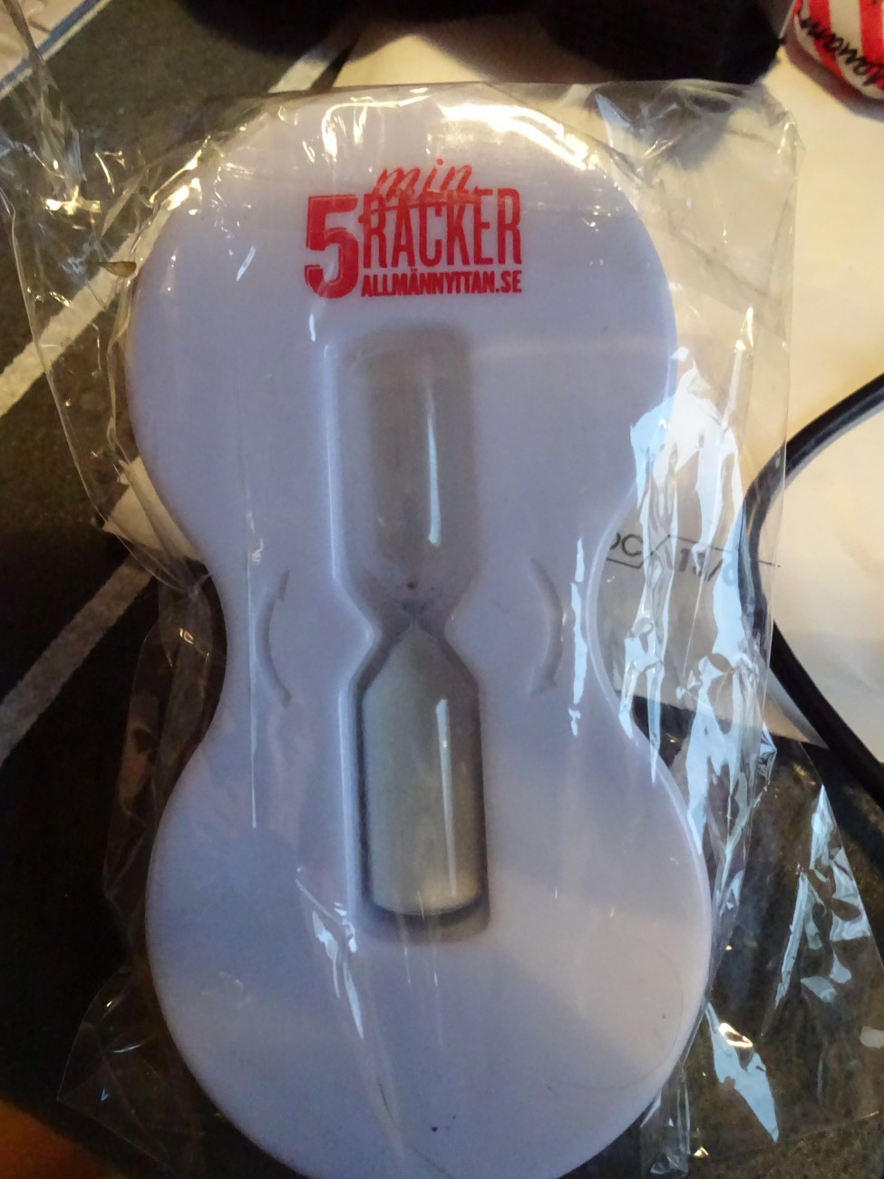 Sen gick jag som sagt på stan, hittade inget ansåg mig besegrad och bussade hem. Hade då fått post, i brevlådan låg ett paket jag till och med glömt bort att jag beställt. Ska ge den till Nyman som är en mästare på att duscha i 15-20 min (efter 20 min så brukar det vara så illa att han har somnat i duschen). Han kommer nog inte tycka att det är världens bästa present, men men han får den bara för att så då behöver han inte va nöjd. Hade det vart födelsedagspresent eller så äre juh en annan femma.