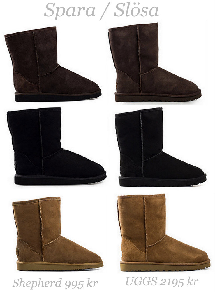Spara vs. Slösa 9 december, 2013 av My Love Johansson Shepherd//HÄR Uggs//HÄR När man ser de såhär känns de liiite sjukt. Skorna är vääääldigt lika men samtidigt så olika. Priserna är olika, skorna är från olika märken men kopior på varandra. Nästan lika är skorna asså, men priserna… HELT olika!