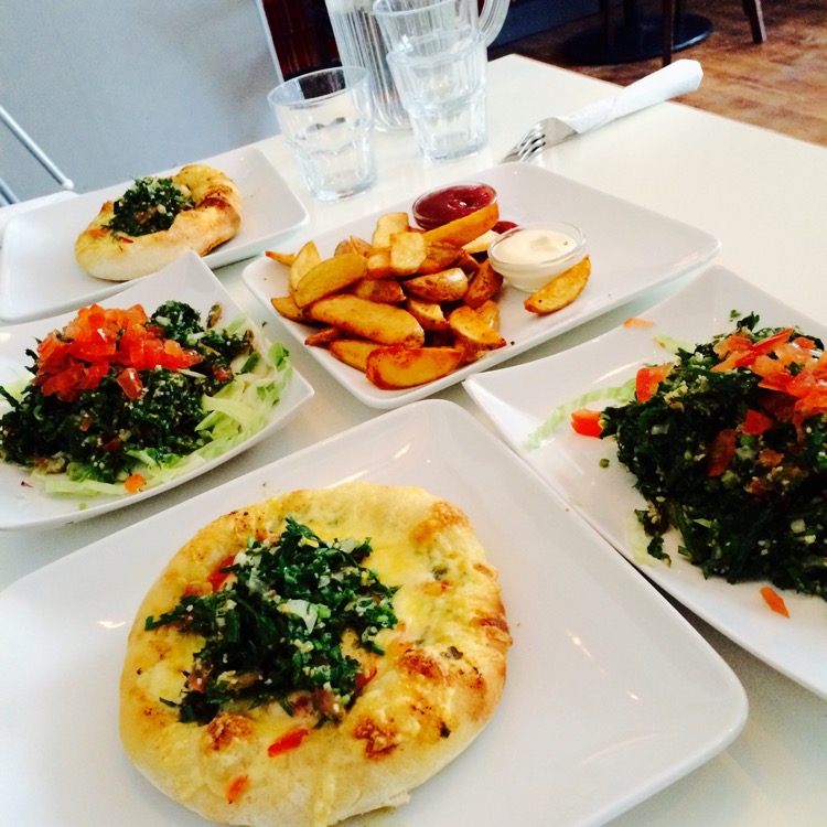 Vitlöks bröd med ost och tomat, sen tabbouleh och klyftpotatis. Så jävla gott!