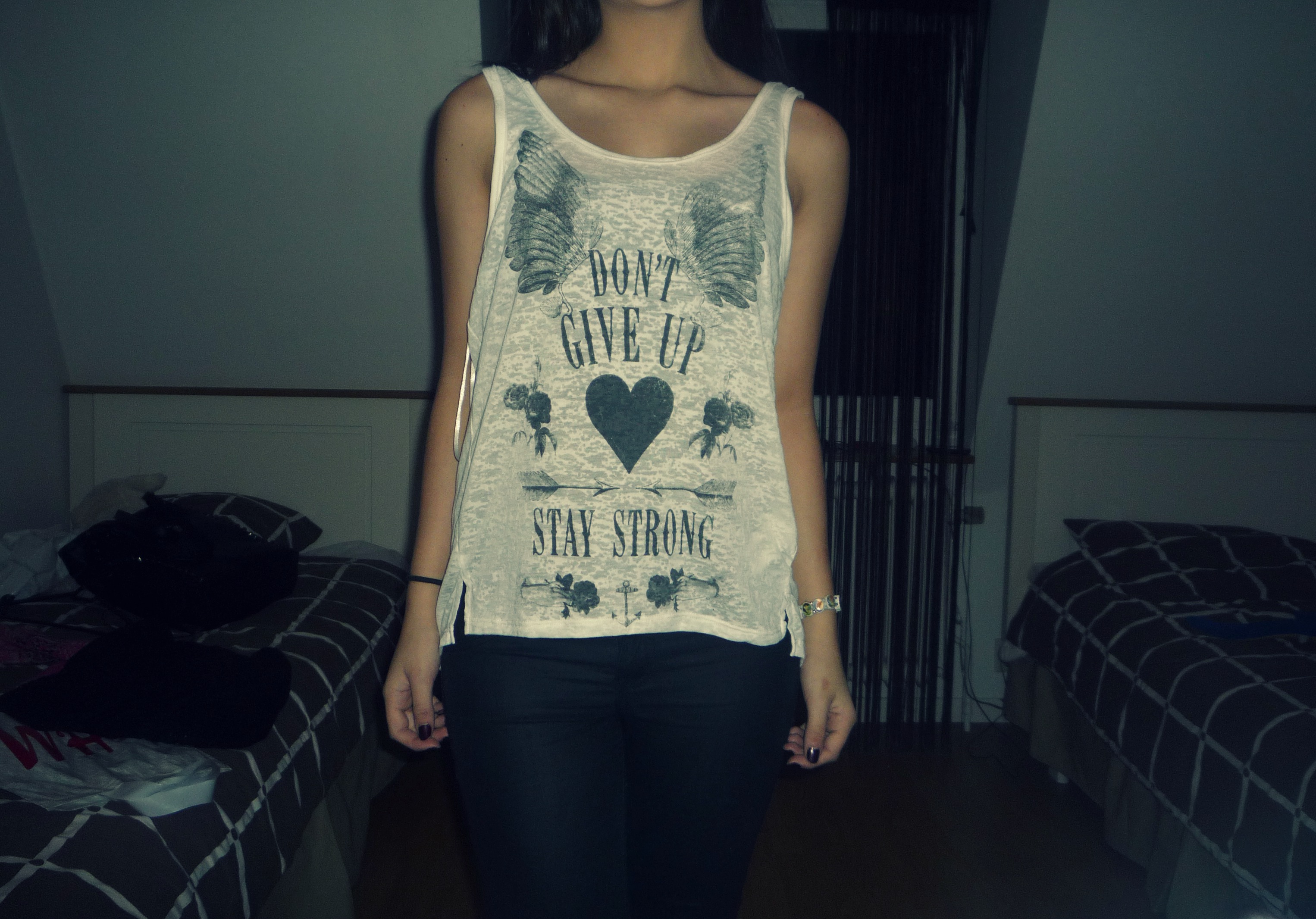 Köpte 3 klädesplagg när jag var i Göteborg i lördags. 1. Från Gina Tricot, 2. Från Zara, 3. H&M. De har börjat med att trycka en massa citat på kläderna, vilket jag tycker om. Det sista linnet innehåller två av mina favorit-citater, Stay Strong & Don’t Give Up. Me love.