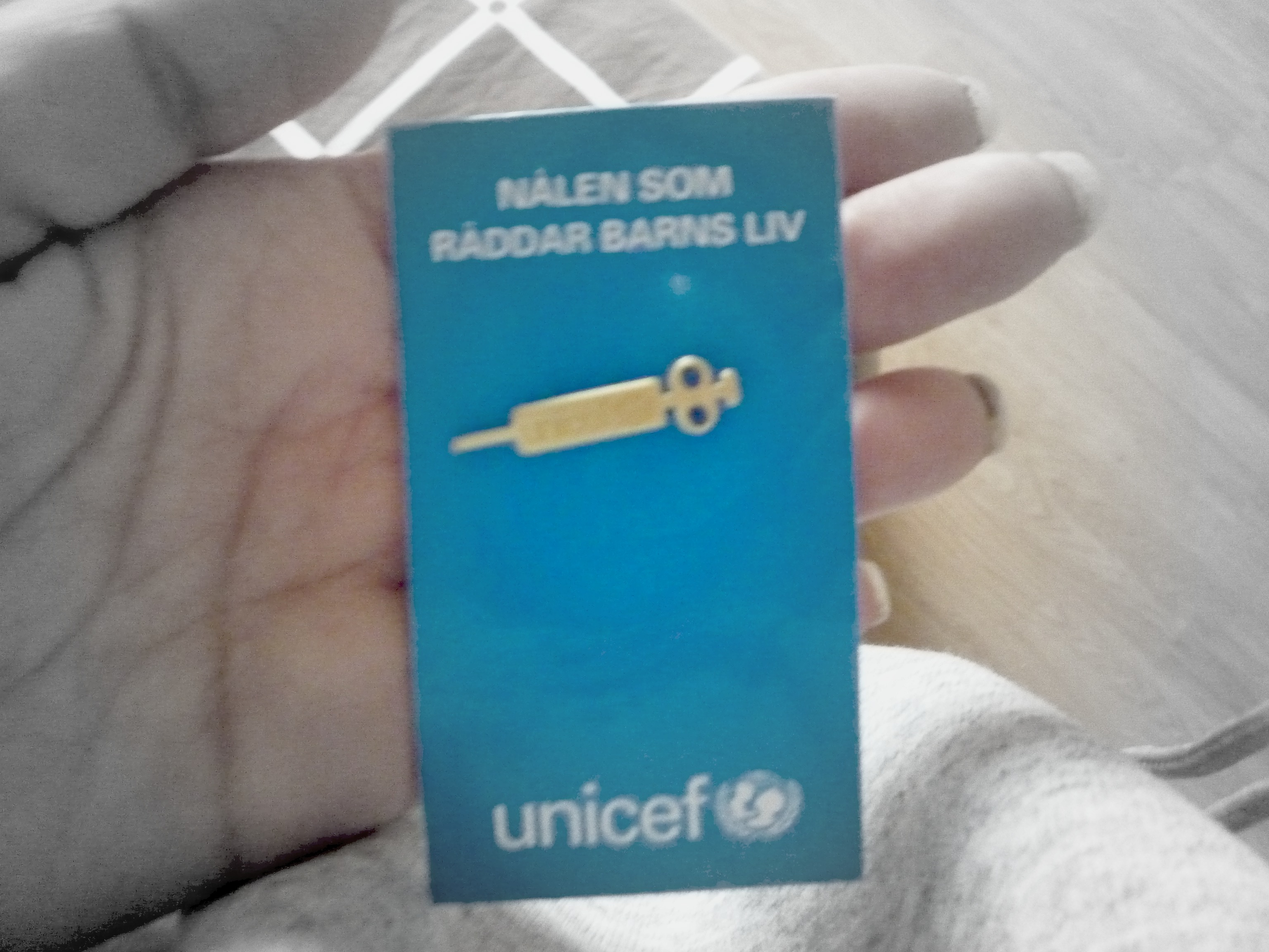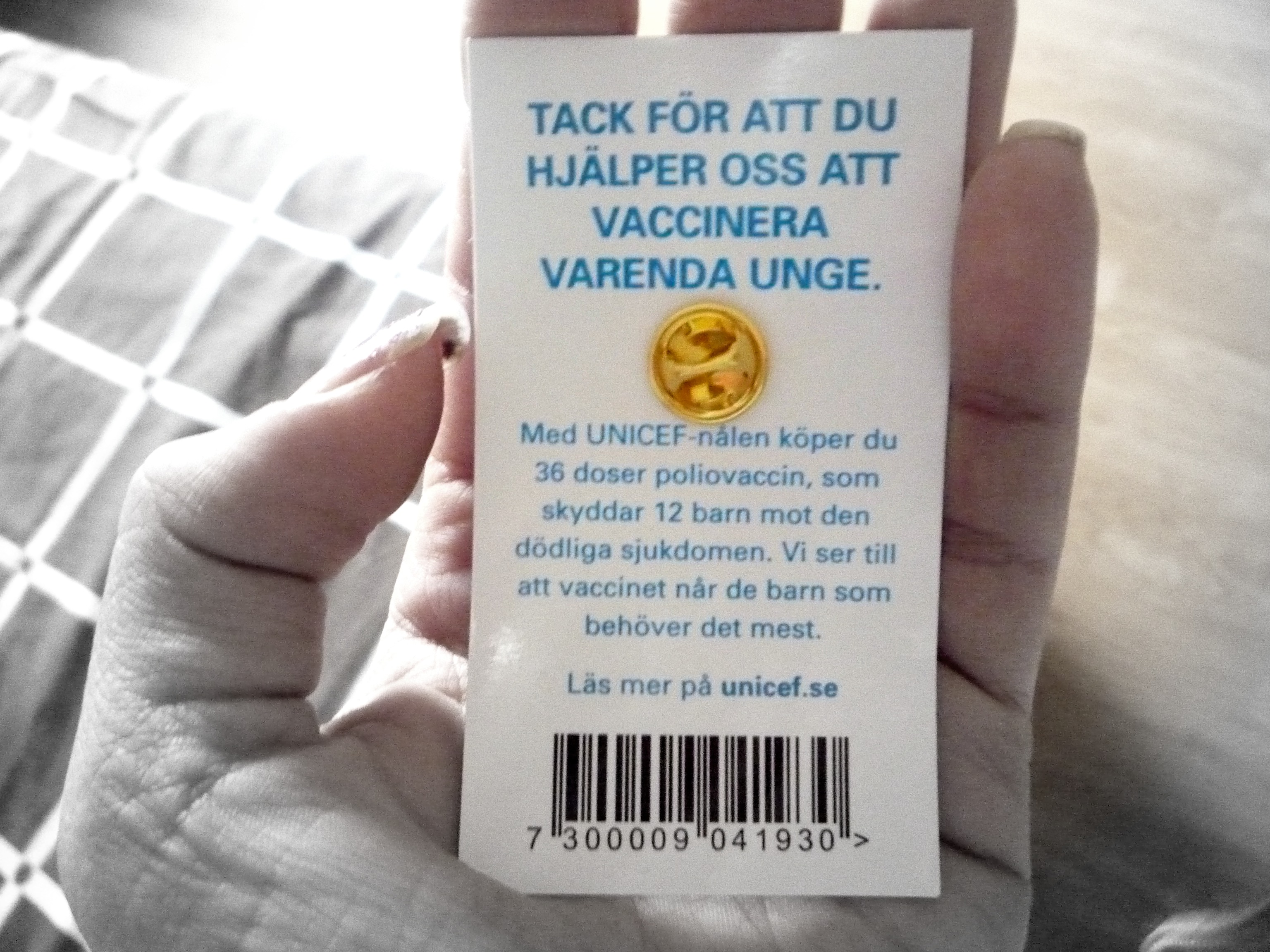 Såg att GinaT sålde dessa för Unicef när jag var där igår. Köpte en på direkten! Tycker ni alla ska göra detsamma. En 50-lapp kan göra så att 12 barn blir vaccinerade för polio! Och det är grymt bra, världens bästa köp!