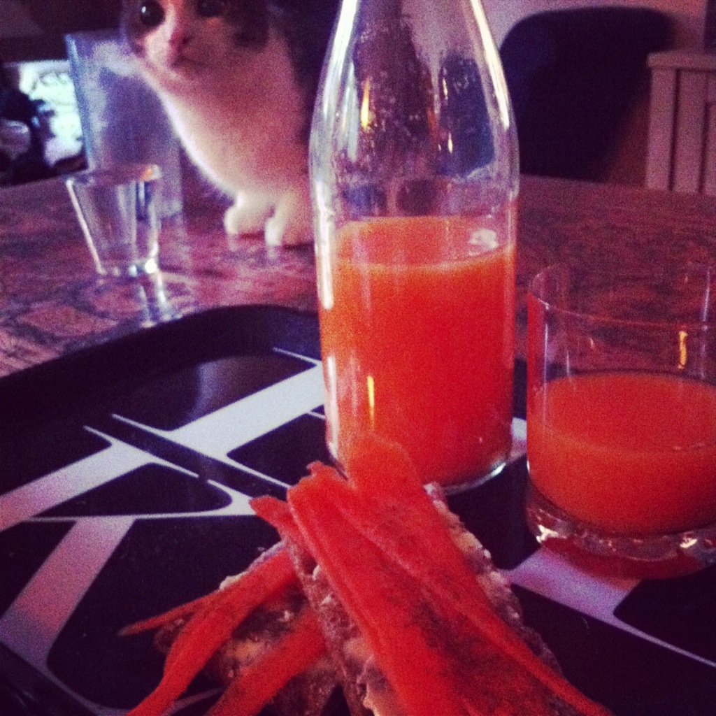 Sportknäcke med morot som pålägg, min färskpressade juice på morot och apelsin +en kopp ingefärste. Perfekt för att starta en morgon!:) Önskar er alla en underbar dag!!