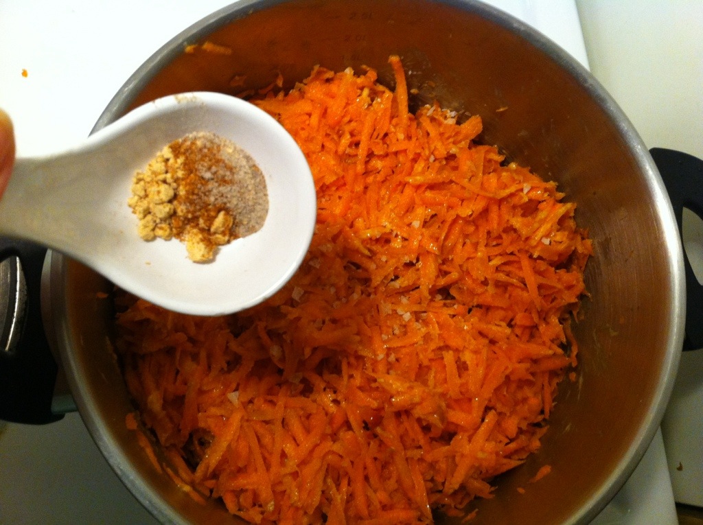 Tillsätter de kryddor jag vill ha och bryner med morötterna. Jag använde cayennepeppar, ingefära, vitpeppar, svartpeppar och salt. Har man gurkmeja så använd, supernyttigt!