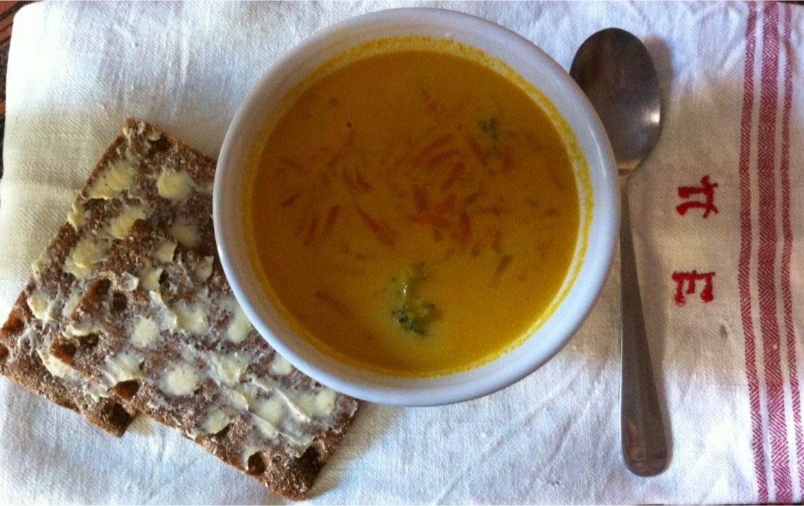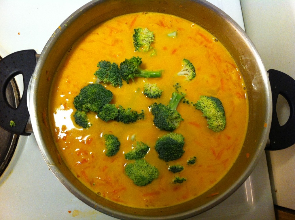 Tillsätter lite broccoli för jag älskar broccoli och jag vill att det ska hända nånting i soppan. Låt soppan koka upp och sedan koka tills önskad konsistens är uppnåd. Tänk på att det inte ska stormkoka och kom ihåg att röra i soppan!