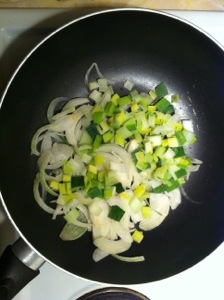 Det som fanns hemma var purjolök och vanlig gul lök. Stek med valfritt matfett till grönsakerna fått färg.
