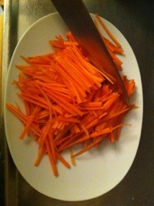 Skiva önskad storlek på morötter, jag gillar långa smala stavar. Förväll morötterna så de bli lite mjuka.