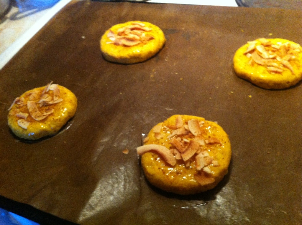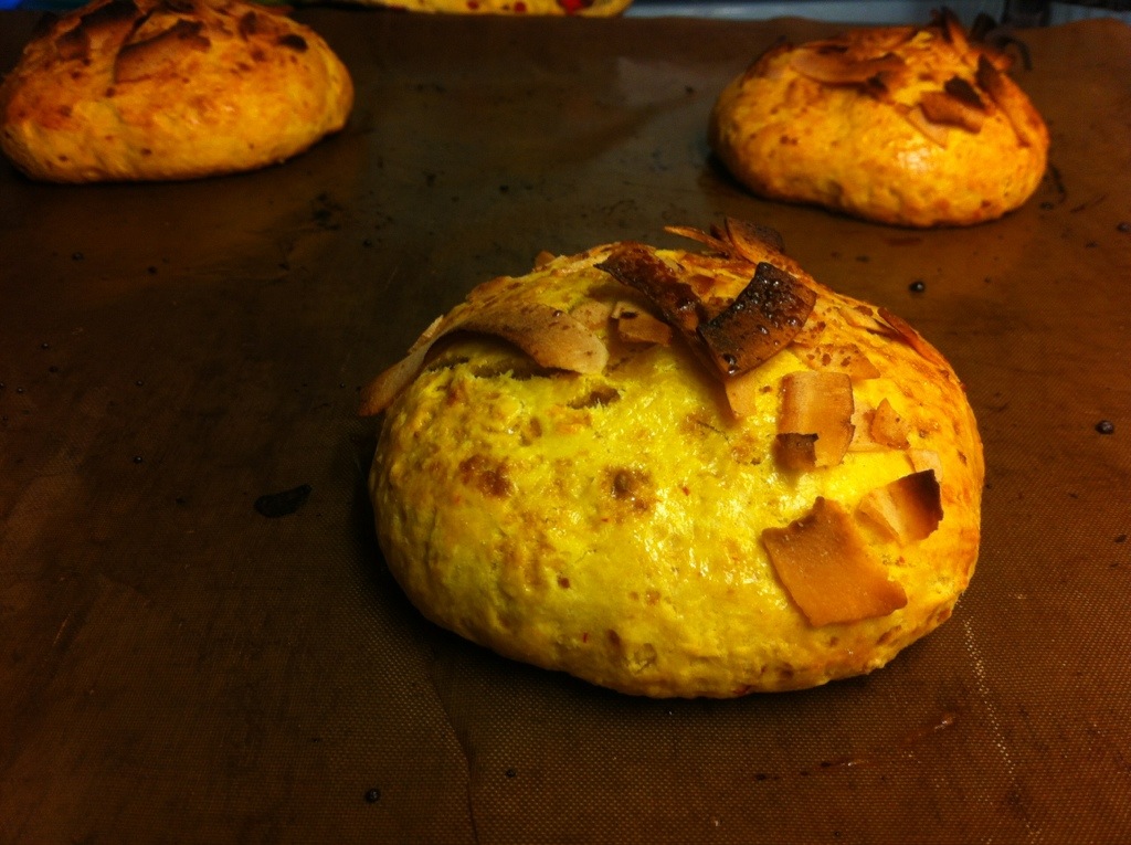 Innan de skulle in i ugnen så penslade jag dem med ägg och strödde på lite kokossocker och kokosflingor, på plåt nr2 så fick de penslas med ägg och strös med flingsalt. Jag låter dem ta sin plats på plåten för bästa resultat.