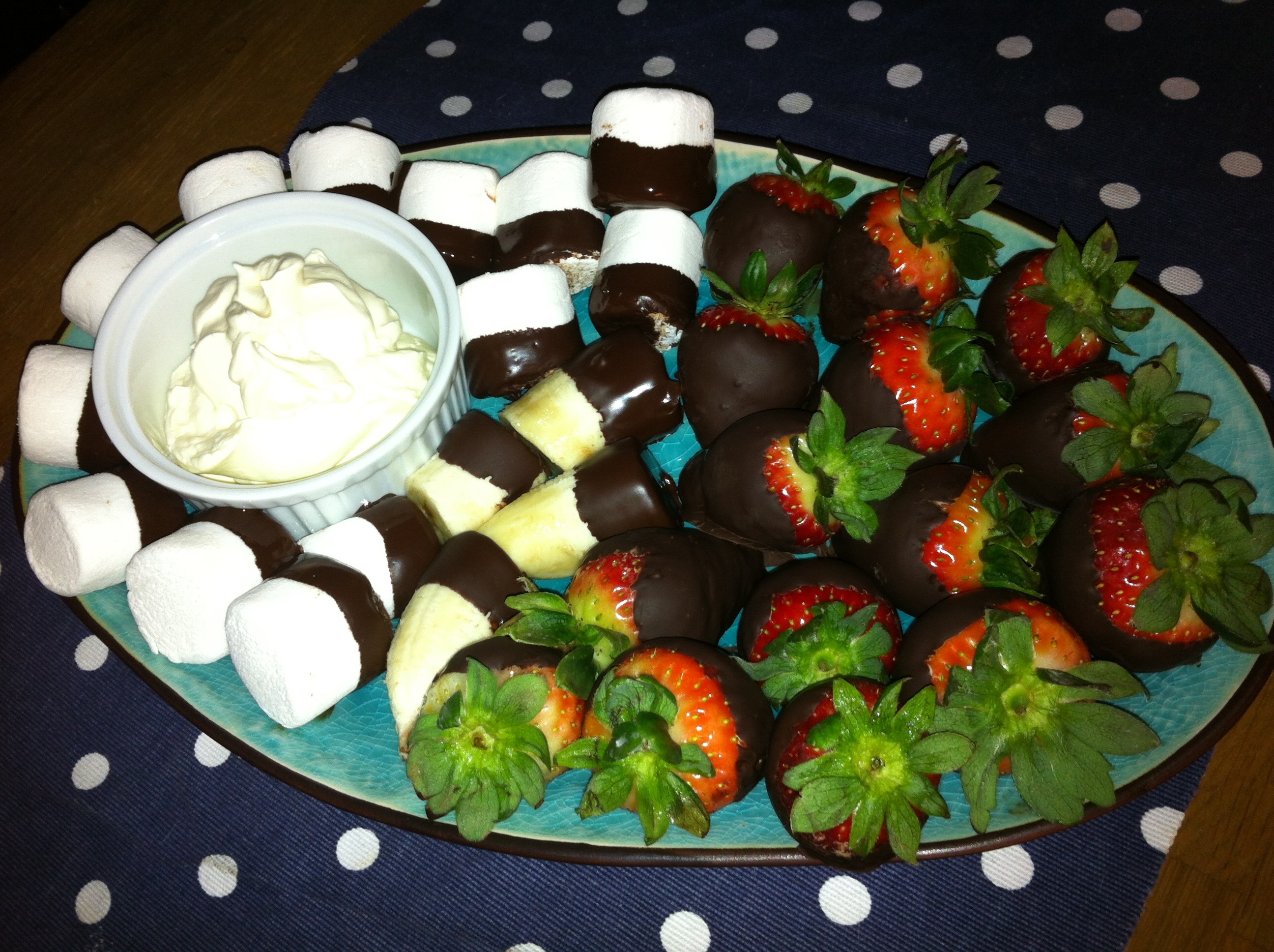 Mums! Idag blev det chokladdoppade jordgubbar, banan och marsmallows. Det serverades med grädde, gott!