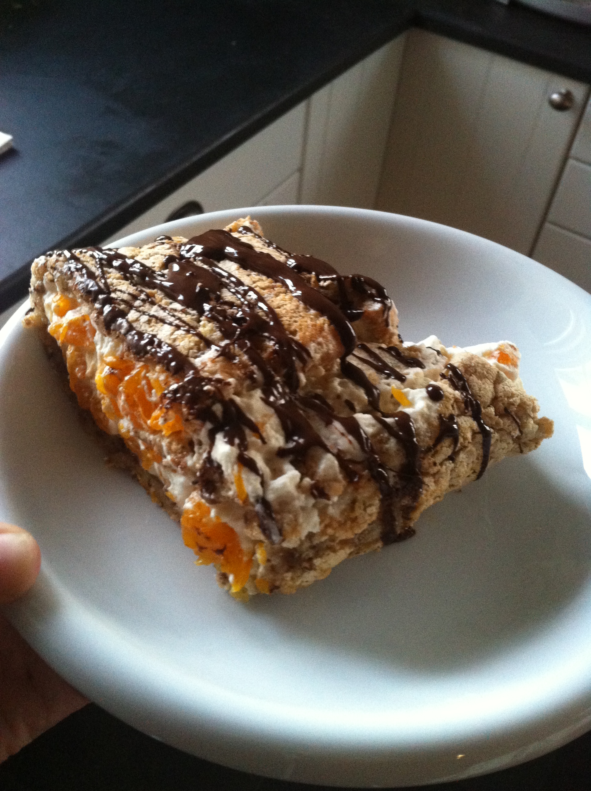 Låt kakan kallna helt. vispa grädden och blanda med de väl avrunna mandarinklyftorna. Bred ut fyllningen över kakan och rulla ihop den.
