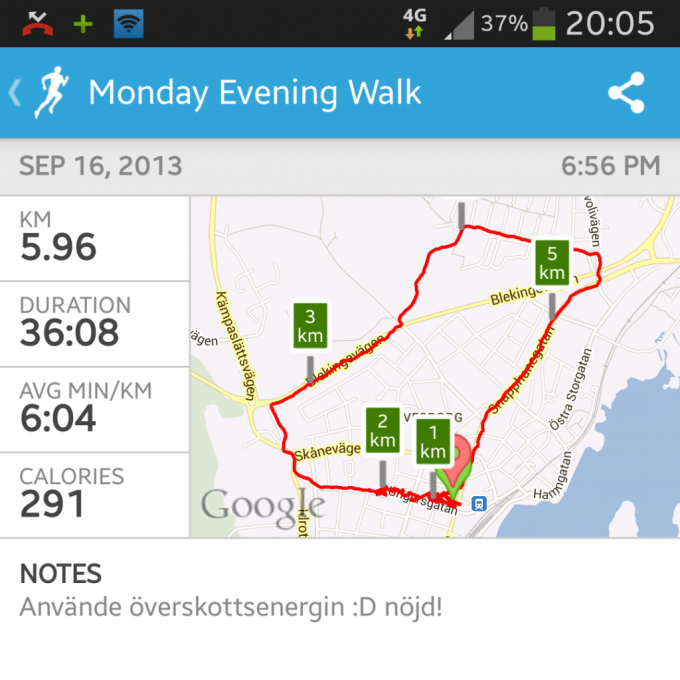 Säger bara, vilken jäkla energi jag hade nu på kvällskvisten, kändes som benen lyfte fram mig. Har aldrig gått så snabbt som ikväll. Underbar känsla att vara igång och börja första veckan med ett personbästa. 😀 Och över 5km nådde jag med under rekordtid. 😉