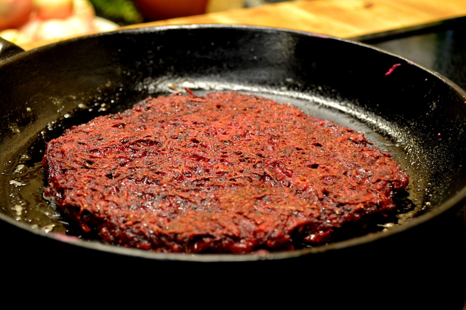 Rödbetsbiff! Råriven rödbeta, gul lök, vetemjöl, mjölk, ägg, salt och peppar. Stekt i rikligt med smör så att den inte fastnar. Åt med hamburgerdressing, ketchup och sallad. Åt närmare två sådana här bamsingar, i omelettstorlek ^^