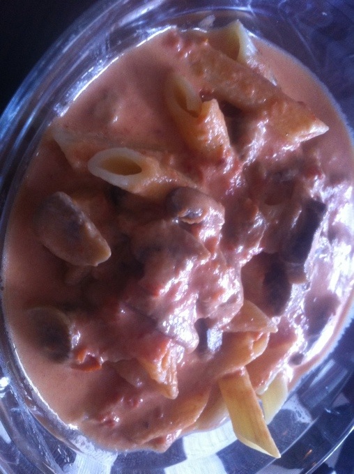 Pasta och pastasås jag och min dotter kommit på själva, den e suuupergod!! 🙂 Har i matgrädde, krossade tomater, stekta champinjoner, parmesanost och vanlig riven ost med lite starkare smak. 🙂 Rostade små chiabatta bitar och citron vatten..