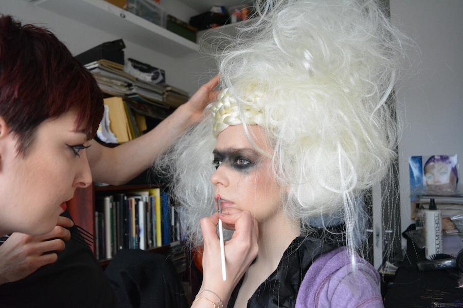 Här är två bilder från plåtningen igår. En då jag blir sminkad och den andra när jag posar framför kameran. Det var en väldigt snabb plåtning, planerad att vara bara 2.5 timmar. Det blir en helt annan stämning på snabba plåtningar. Vet inte helt om jag gillar det eller ej 😛 Men det gick bra igår och jag hoppas jag får några bra och coola bilder från den här. Stilen som makeup artisten och hårstylisten strävade efter var grunge geisha. Så liksom messy och fint på samma gång. Svårt att förklara. Blev en annorlunda smokey eyes som gick över näsan, nästan som en mask. Sedan på läpparna satte hon endast färg i mitten. Och som ni kan se på bilderna så var mitt hår galet stort. Världens fluff med flätor framtill. Lite roligt att han valde min gamla hårfärg på löshåret.