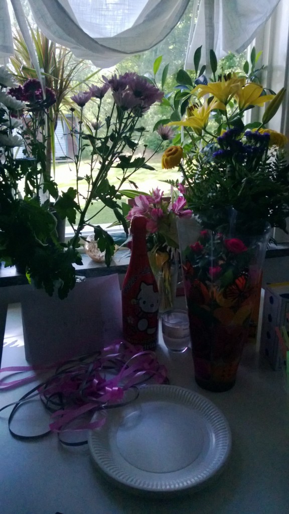 jag fick galet mycket blommor! har knappt plats för alla! så fina. så sjukt fint väder ute, men snuttan blev trött och vill inte ligga i vagnen så vi får hålla oss inne medans hon sover middag:)
