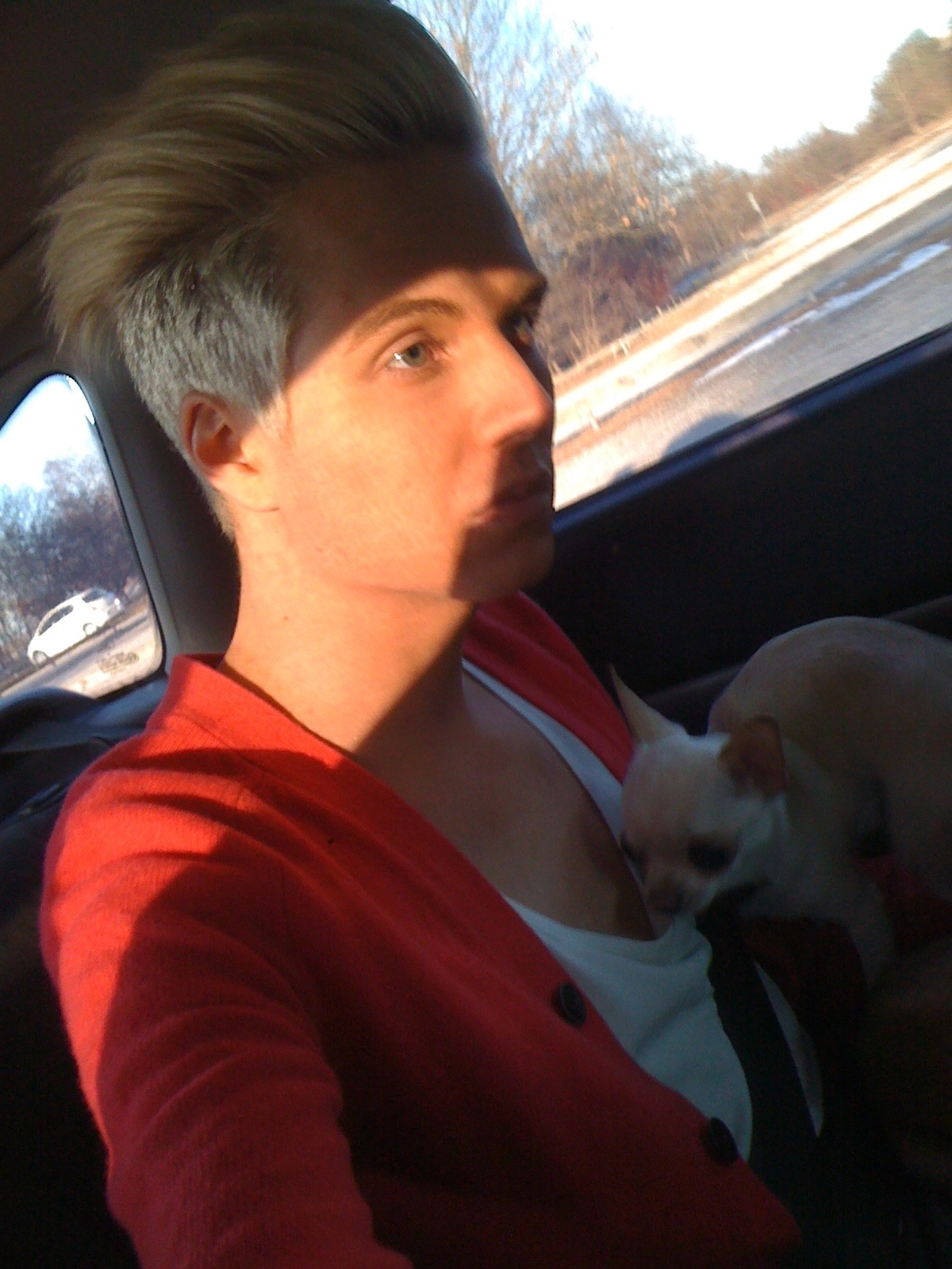 Sitter i bilen påväg hem efter fotograferingen. Galet kallt ute trots att solen står på så det blev lite svårt att agera normalt framför kameran. Har inte sett så många bilder ännu så vet inte hur det blev. Vet inte om jag lägger upp några idag eller inte, vi får se. Nu ska vi i alla fall käka nått, är dö hungrig! Hörs sen!