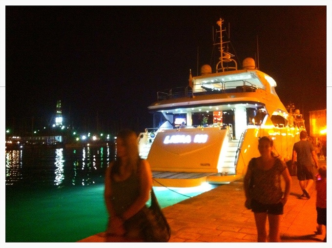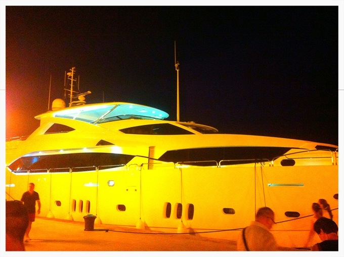 Kolla in den här ”lilla” båten. Får inte ens med hela på bild. Galet cool! Och längst bak i fyren sitter en kvinna. Givetvis en yngre blond variant, tillsammans med en dubbelt så äldre gammal gubbe. Det tycks aldrig slå fel, eller hur? 😉