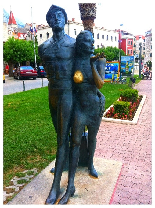 Innan ovädret drog in över oss hann vi dra oss mot bilen och vidare till Markarska Rivieran. Fint ställe där vi slog oss ner vid en mysig restaurang för lite mat. Lite mulet här, men det är bara skönt! Närmare 30 grader ändå liksom så några regndroppar lite då och då är bara skönt snarare än tvärtom. Statyn på en av bilderna nedan var något som skulle bringa tur tydligen om man kände på kvinnans bröst. Det var bara att tafsa på för glatta livet med andra ord.. 😉