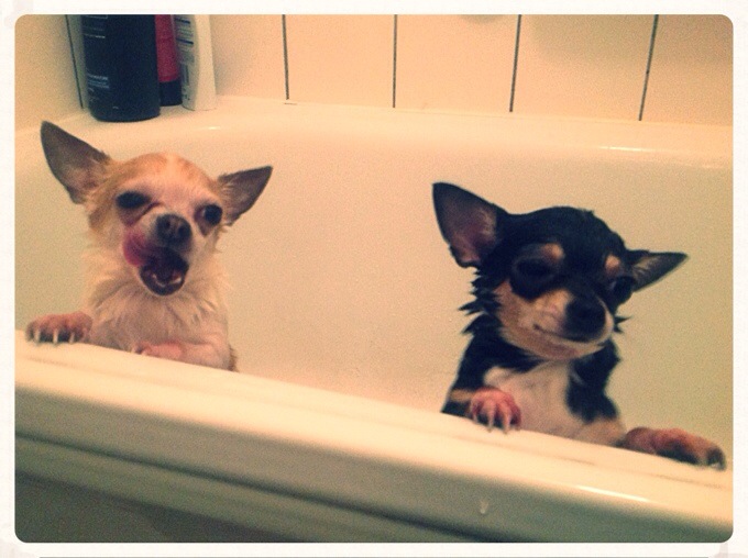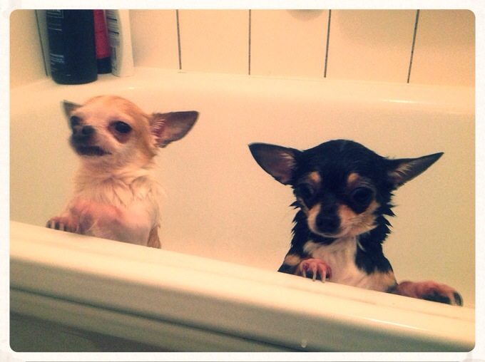 Börjar min underbart lediga dag med att bada dogsen. Eller två av dem åtminstone. Mitt tredje lilla hjärta – Fendi – löper och får därför sova borta under den perioden. Inga fler barn gjorda här inte tack! 😉 Tror ni dom är glada på mig nu? Nej, inte det minsta. Dixi ser både trött och livrädd ut. Rocky enbart trött och sjukt sur. Men dom luktar ju så gott sen och blir ju så glada när det väl är klart.. Nedan ser ni vilket schampo jag använder mig av till hundarna. Ett schampo och ett glansspray som man sprutar på efteråt. Lite dyrare men väldigt bra. Jag menar, det finns väll en anledning till varför våra hundar har den bästa pälsen en chihuahua faktiskt kan ha eller hur…? 😉