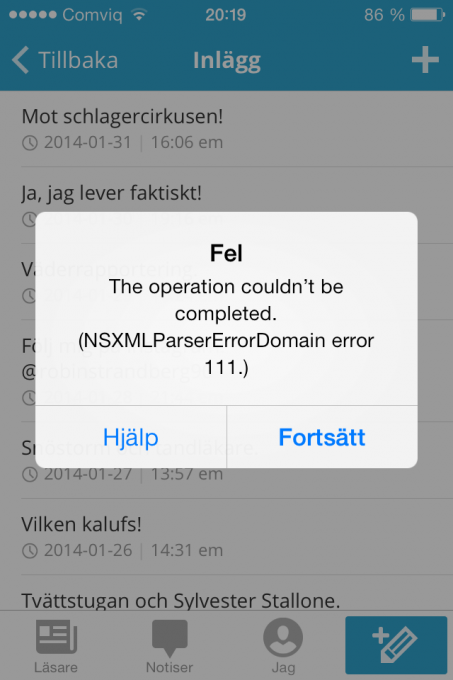 Ny vecka! Det innebär för mig – och säkerligen för många andra – jobb och andra vardagligheter. Har haft en bra helg! Fredagen tillbringades som sagt på Malmö Arena där vi kollade på repetitionerna av Melodifestivalen. Lördagen blev det lite shopping under dagen och sen fest + utgång. Och gårdagen var en hederlig lugn Söndag framför tvn. Jag har varit dålig på att uppdatera är inne, men det beror inte på mig utan snarare att WordPress appen där jag bloggar ifrån mobilen har slutat fungera. Jag vet inte hur jag ska gå tillväga för att fixa detta, men finns det något snille där ute som möjligtvis vet kan ni kolla bilden nedan. Det är så det ser ut när jag ska uppdatera, lägga in inlägg osv. ’Hjälp’ knappen förstår jag mig inte på, och ’Fortsätt’ knappen resulterar bara i samma problem. Tacksam för hjälp, men nu vet ni varför det kan bli glest här inne ett tag.