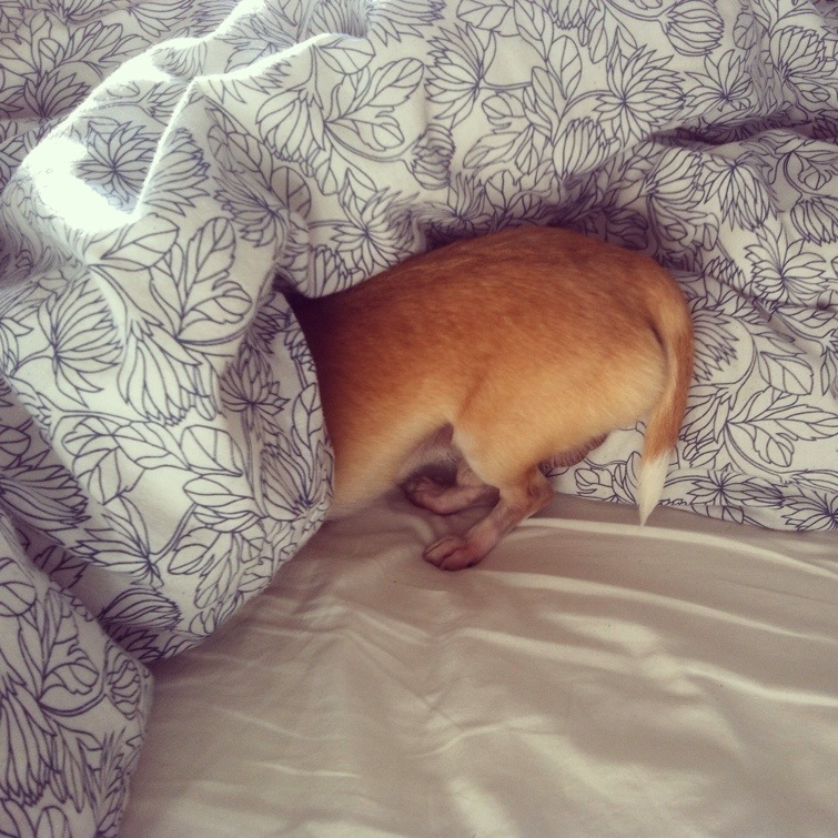 Alarmet ringer. Satan inte nu igen är det första jag hinner tänka. Inte en vecka till. Alarmet fortsätter ringa. Andra tanken slår det mig att jag enbart jobbar Måndag och Tisdag. Sen är jag faktiskt ledig i ett par dagar. Jobbar dock helgen för ovanlighetens skull, men det känns som att det kan vara okej. Alarmet fortsätter ringa och jag inser att det inte lönar sig att ligga och dra sig. Brukar ändå bara sluta med att jag försover mig. Ser mig om efter lite mys med hundarna innan jag stiger upp. Det kan man väl åtminstone få vara värd en Måndag som denna. Kollar till vänster och ser en hårig liten röv sticka fram ur täcket. Rocky har dom mest konstigaste sovställningarna ni kan ana. Nedan ser ni ett bildbevis på en av dem. Ikväll är jag ensam hemma, efter jobbet. Bara jag och djuren framför tvn eller på balkongen, vi får se. Jag har sedan länge planer på att skriva en bok (ja det är faktiskt sant, seriöst och på riktigt) så vem vet om jag orkar lägga den sidan till ikväll efter en dag på jobb.
