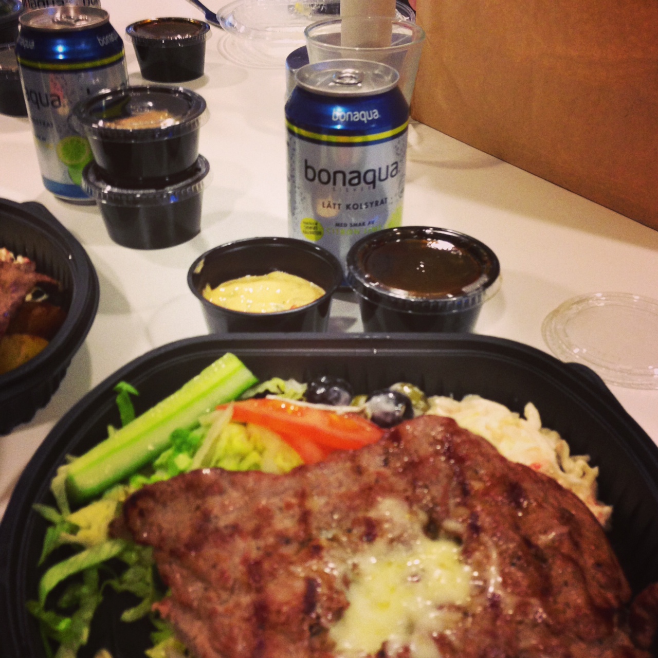 Lovade ju er att jag ska uppdatera flitigt om maten och träningen så här nedan kan ni se vad jag åt till lunch. En köttbit med sallad och till det drack jag en ramlösa. Jag äter 2mål om dagen samt dricker vaatten, THATS IT! Jag vet att man ska äta frukost och att det ”är dagens viktigaste mål” men jag har inte tid med det och är inte så hungrig på morgonen heller.