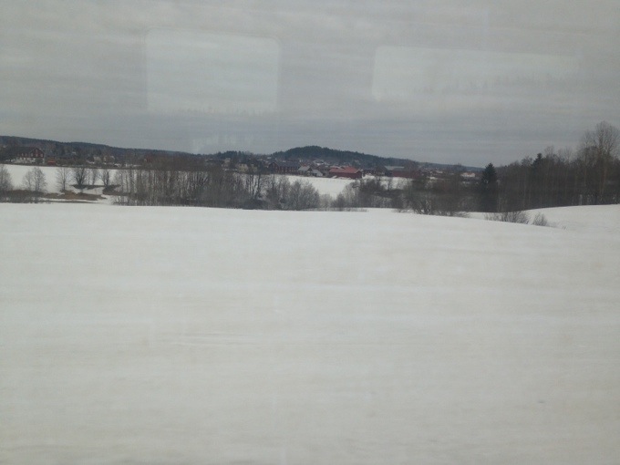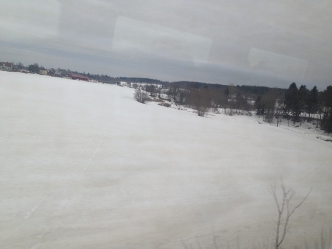 Andjelina sover på mig och jag börjar bli orolig om vi hoppat på fel tåg :/ jag klagade på våren i Stockholm men detta tar fan priset. Det snöar som fan och jag ser bara skog, skog och lite mer skog!
