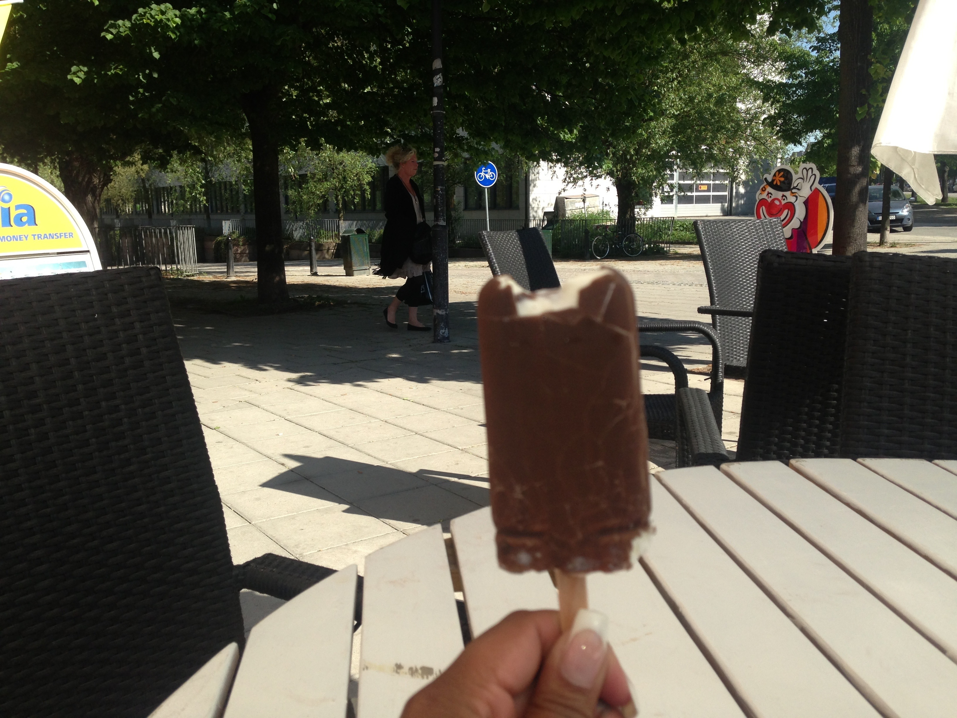 Jag sitter i solen nu och käkar en glass medan jag väntar på bästis. Vi ska förbi jobbet och fixa lite grejer sedan är planen att jag ska träffa Amir, Jackie och Douglas 🙂