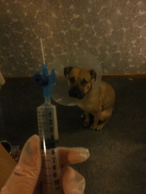 Lilltjoppan hade fått en infektion i kinden efter bettet från den andra hunden, så dom öppnade upp, tog bort drenaget och spolade rent… fick en mindre lätt uppgift, tvätta hennes sår med spruta ett par gånger per dag…