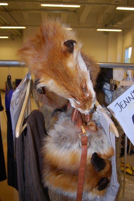 En läskig mössa och väska med riktiga rävhuvuden och svansar, sånt tycker jag inte om!!