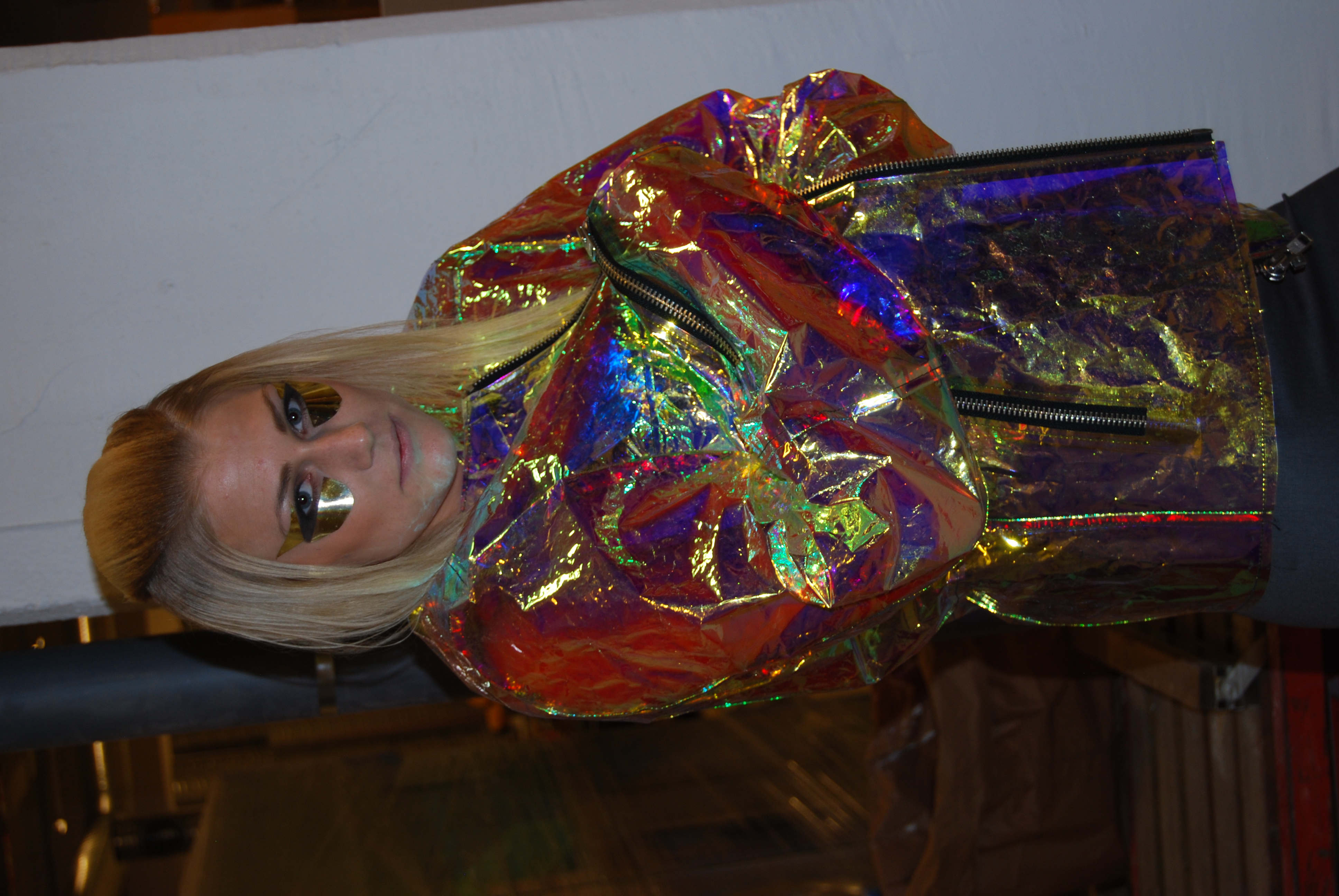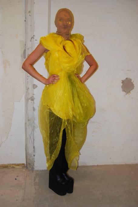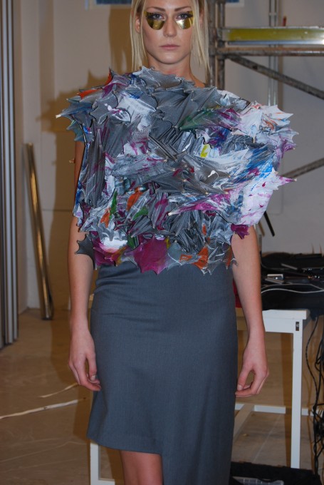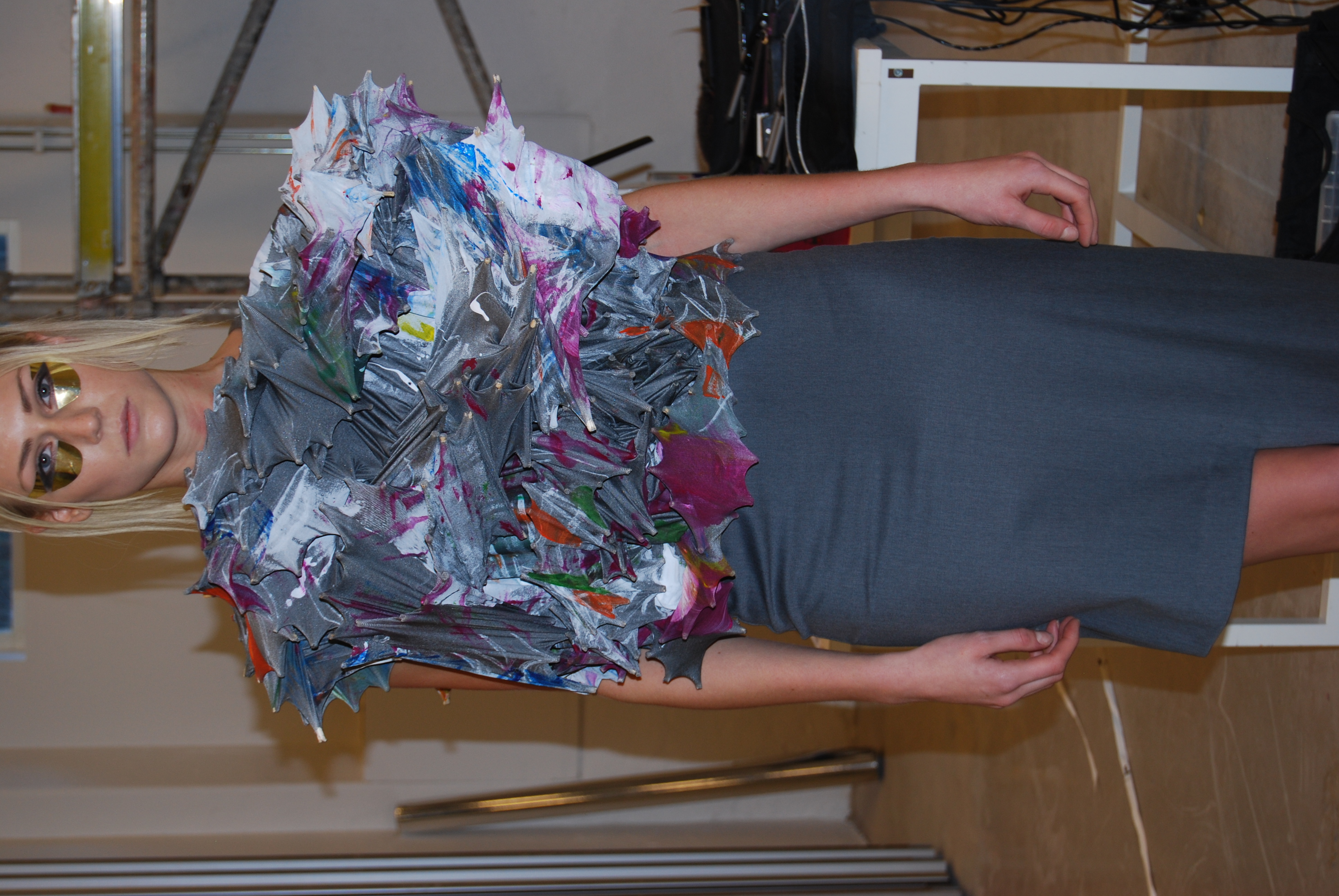 Den här tröjan va riktigt cool, dock så gjorde den otroligt ont att ta på sig. Den var full med träpinnar som ren upp mina armar, men ska man vara ”fin” så får man lida pin! kläderna kommer ifrån Textil högskolan i Borås. Otroligt konstiga kläder men riktigt roliga att kolla på och man blir imponerad av deras kreativitet.!
