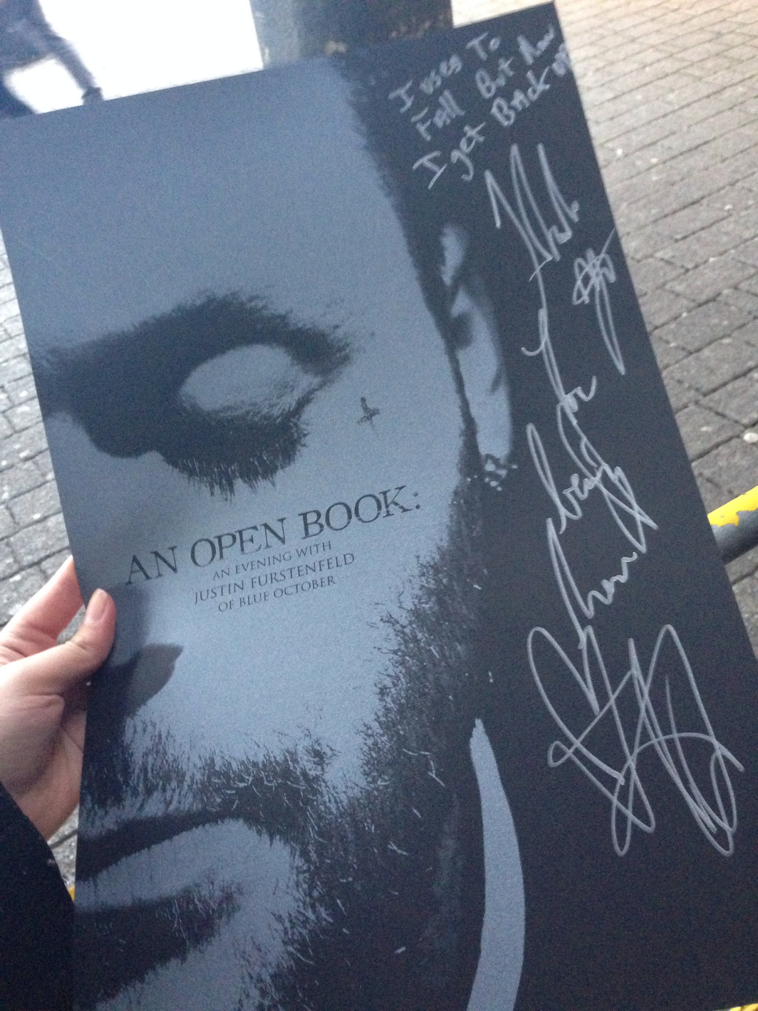 IMG_0596-0.JPG IMG_0600.JPGAlltså, jag vet inte vad som hände men helt plötsligt beslöt sig mina två största förebilder att turnera i samma städer med bara en dags mellanrum. Så i onsdags var det Gaga och igår, torsdag, såg jag Justin Furstenfeld på O2 academy här i Birmingham. Jag hade Meet&Greet-biljett och klockan 17 var det insläpp för oss. Träffade två killar i kön som var fantastiskt söta, Stevie och Chris. De var helt lyriska över att få träffa Justin. Det var jag med, självklart, men detta var deras första gång. Som sagt, 17 var det insläpp och då fick vi gå in och lyssna på en cover och en unreleased låt. Började nästan böla redan då. Sedan var det dags för signeringen, jag nästan skakade. När jag kom fram till bordet sa han ”I KNOW YOU! How are you doing, sweetheart?” och jag typ dog haha. Sedan pratade vi en liten stund och sist bad jag honom att skriva ett valfritt citat ur Blue October’s låt ”Fear” som är en av mina absoluta favoriter. ”I used to fall but now I get back up” kommer härmed att bli min nästa tatuering vilket är jättespännande. Ska se om jag kan få det gjort när jag är i London nästa vecka! Det känns speciellt att jag alltid kommer att ha honom nära, som en påminnelse att va som än händer så kan jag resa mig igen…