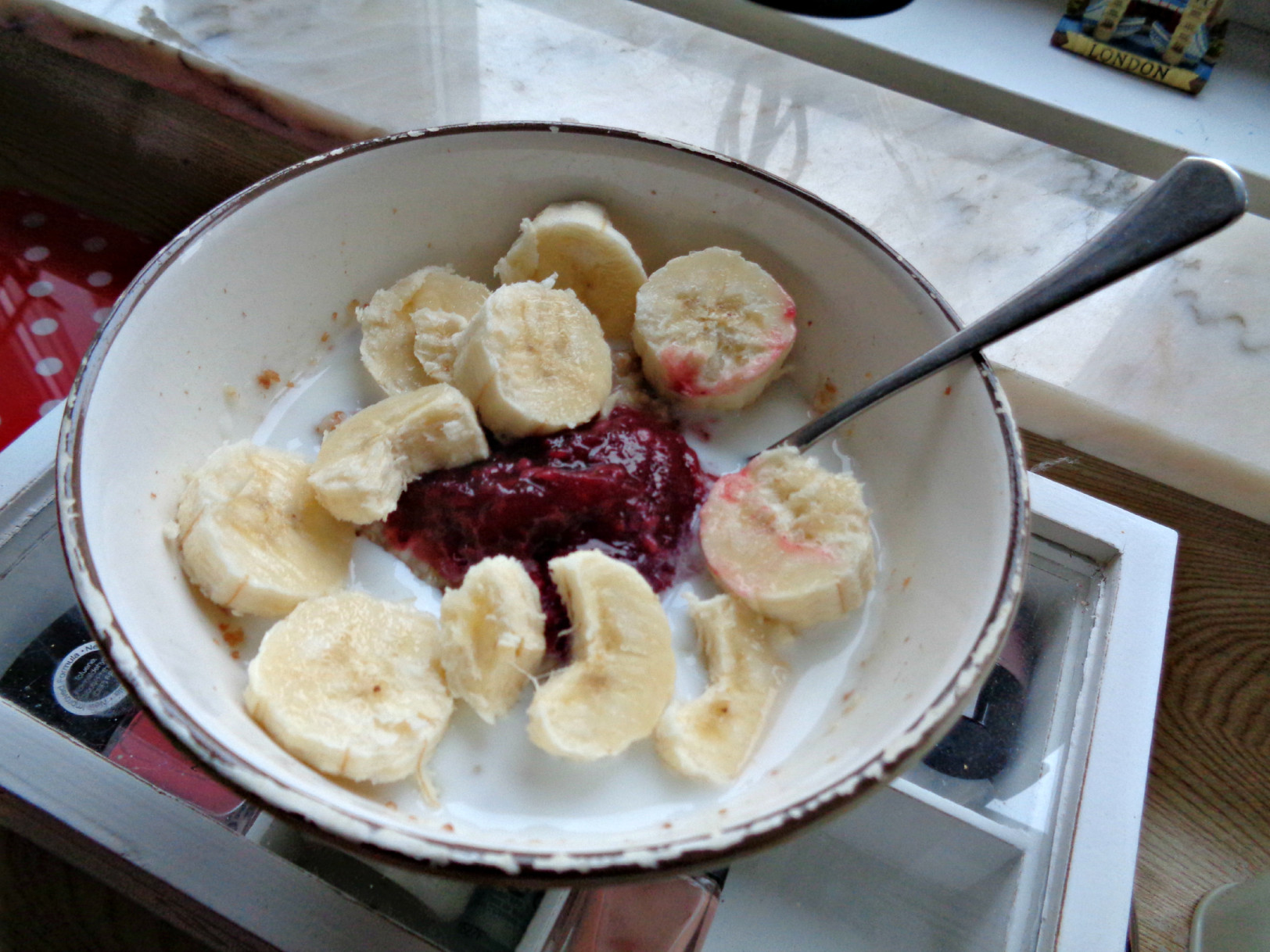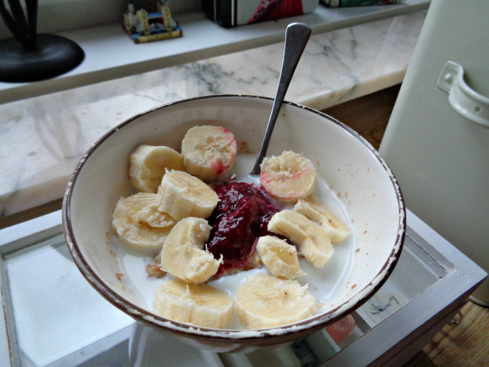 Morning sunshine. Nu är frukosten fixad, Frasse har fått mjölk och jag ska strax ta och dricka mitt kaffe. Tänk att igår var en så viktig dag och idag så rullar allt på som vanligt… Oh well idag blir det fiberhavregrynsgröt med en klick osockrad lågkalori-sylt, mjölk och banan. Och för att lyxa till det för att det är lördag och för att gårdagen var så jobbig lyxade jag till det med en minifrutti som jag hittade i kylskåpet. Vill ni veta en sak? Igår tröståt jag inte! Däremot köpte jag en flaska påskmust som jag druckit men om man jämför med hur det har varit så är det här en stor framgång!