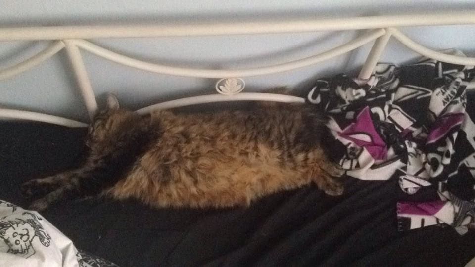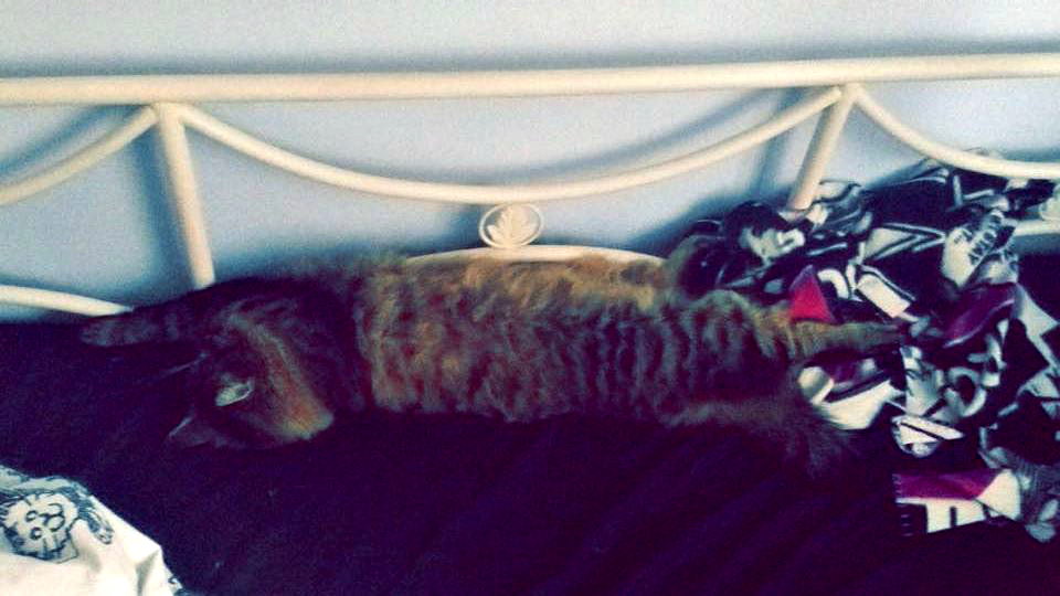 Det är inte bara jag som är mosig idag, denne lille herre har inte gjort annat än att sova – utsträckt över hela sängen! Frasse är en sån kille som har sina sovplatser i perioder. Ibland är det soffan, ibland golvet, ibland min säng osv. Nu är det sängen som gäller och då får man leva efter det. Och det betyder att man får trängas om en liten bit av sängen. Tänk att en så liten katt kan ta upp en så stor möbel. Det gör ingenting dock, det är bara mysigt. Okej, lite bortskämd är han väl.. men det är ju han och jag mot världen!